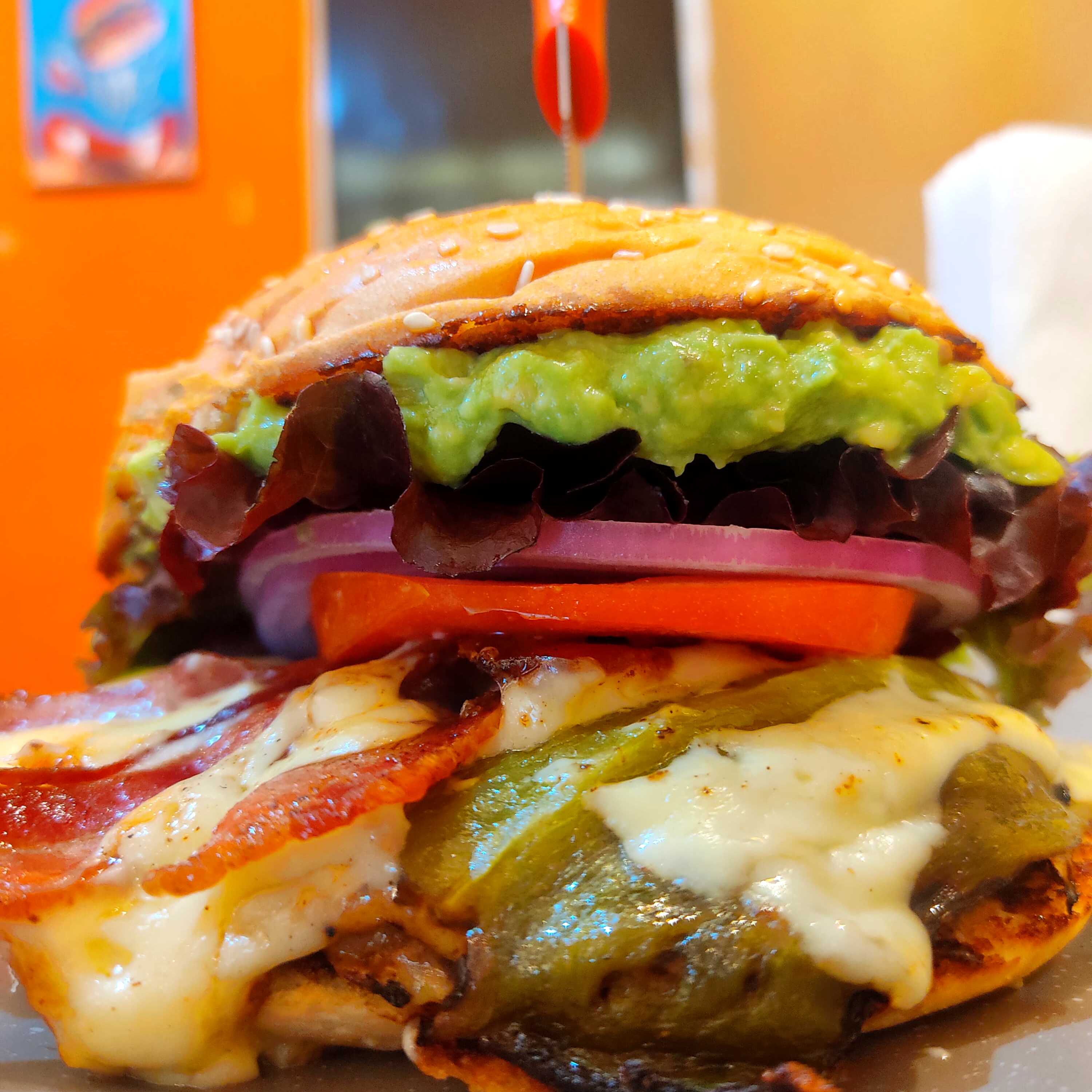Carne de sirloin preparada, tocino, guacamole y un anaheim gratinado con papas a la francesa. Incluye aderezo chipotle y catsup