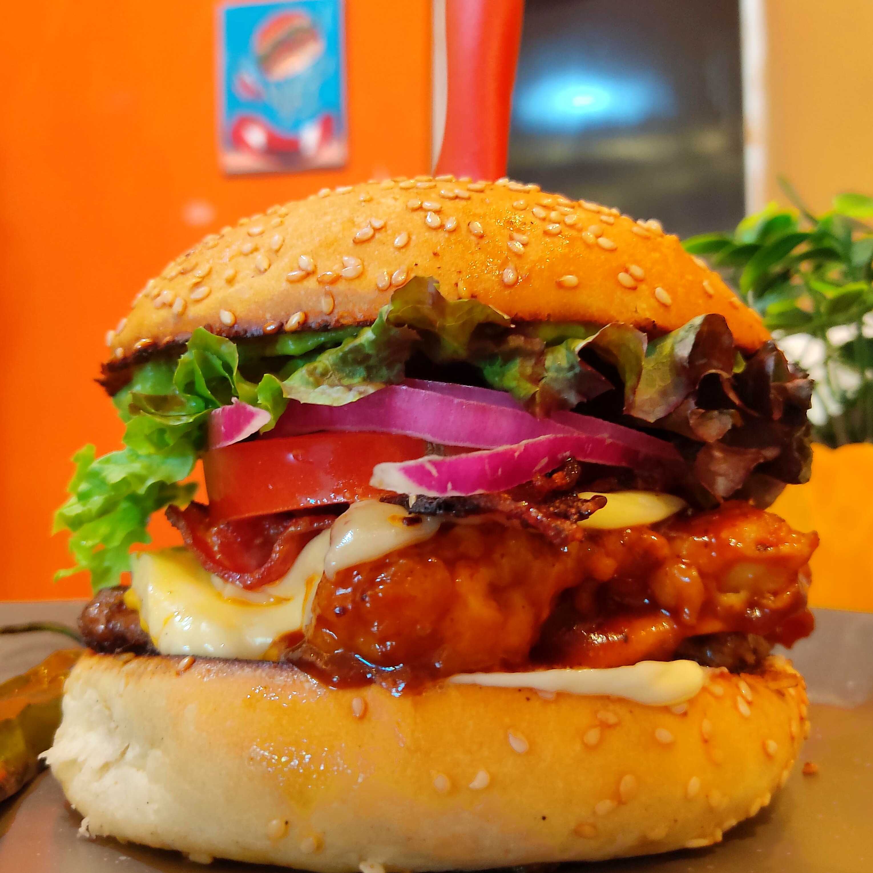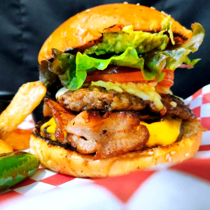 Hamburguesa sirloin , doble carne, doble tocino,queso américano y gouda gratinado,, con guacamole y papas francesas