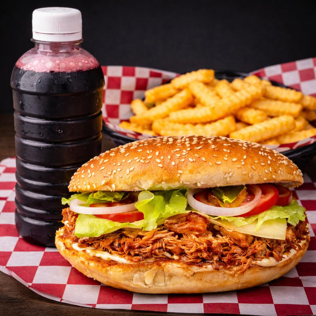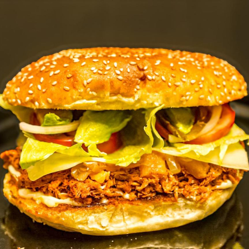 Jugosa pierna de cerdo marinada lentamente en mezcla casera de chiles secos, cítricos y especias, acompañada con queso manchego, piña tatemada, cebolla caramelizada, lechuga y tomate. Coronada con chile jalapeño curtido, aguacate fresco y aderezo de la casa.