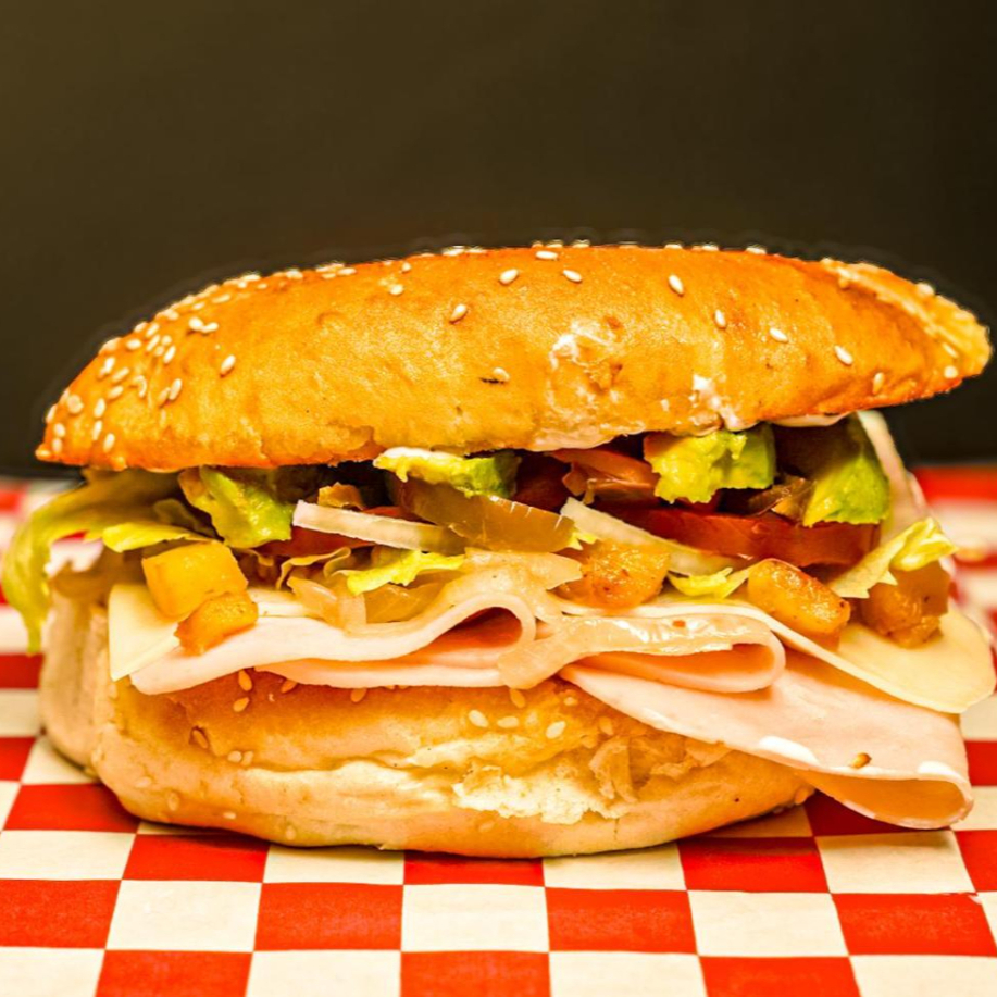 Láminas de jamón con queso manchego, acompañada con piña tatemada, cebolla caramelizada, lechuga y tomate. Coronada con chile jalapeño curtido, aguacate fresco y aderezo de la casa.