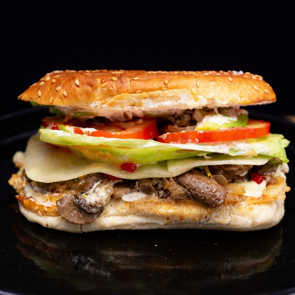 Champiñones salteados en chile morrón, acompañada con queso manchego, piña tatemada y cebolla caramelizada, lechuga y tomate. Coronada con chile jalapeño curtido, aguacate fresco y aderezo de la casa.
