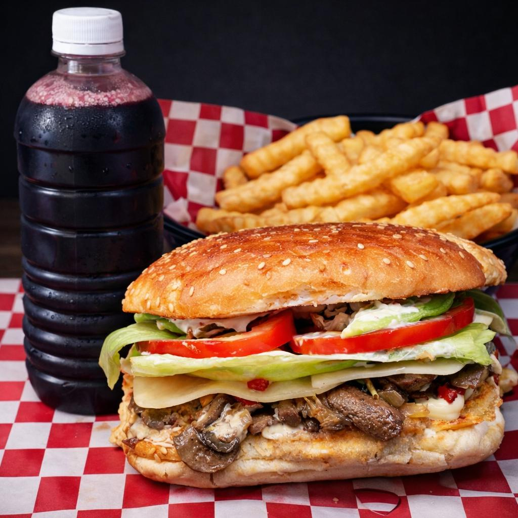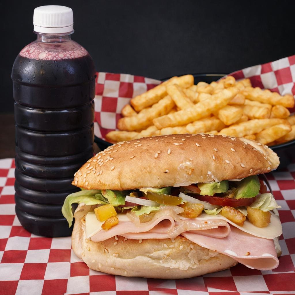 Sinaloense, papas fritas y Agua de Jamaica.