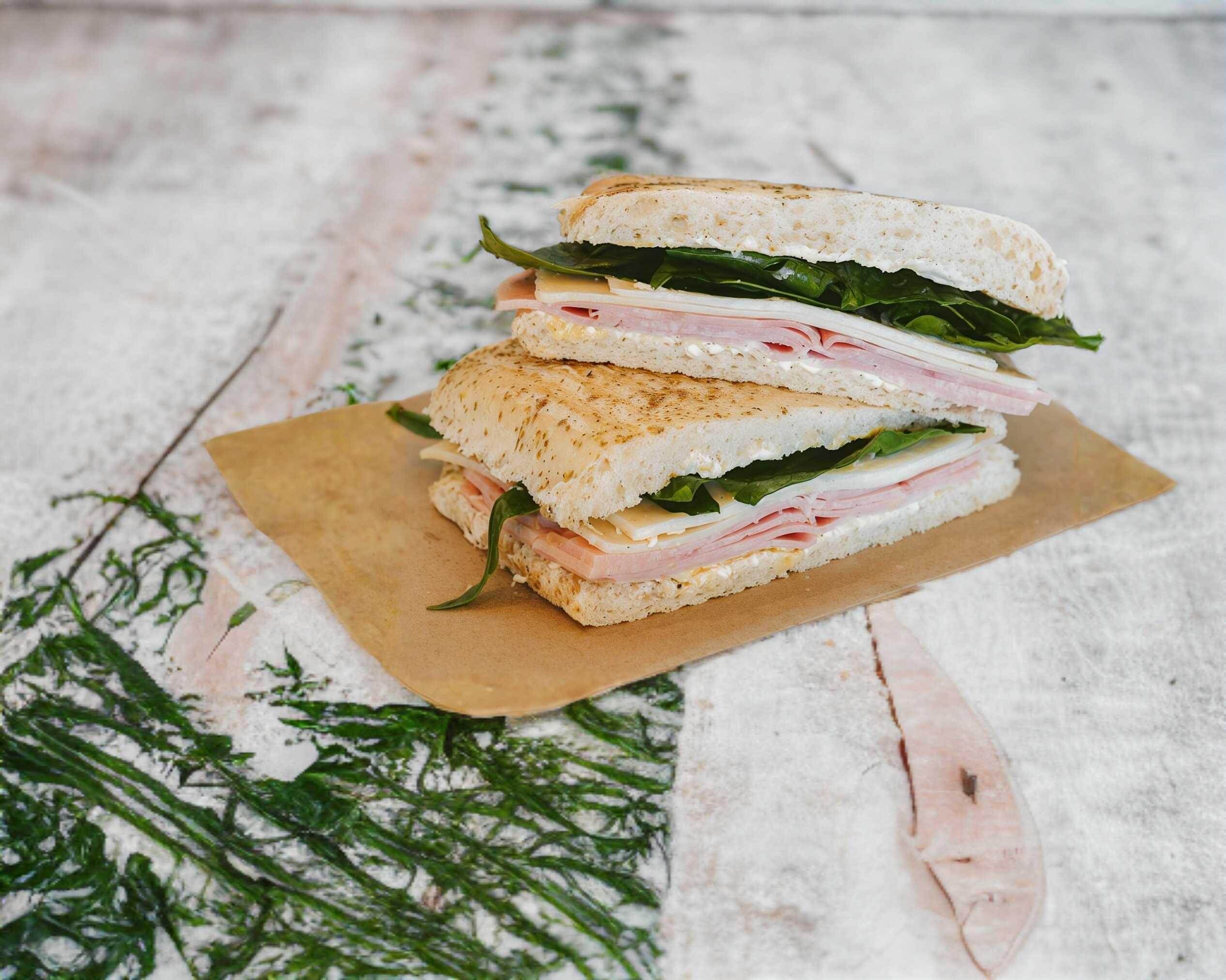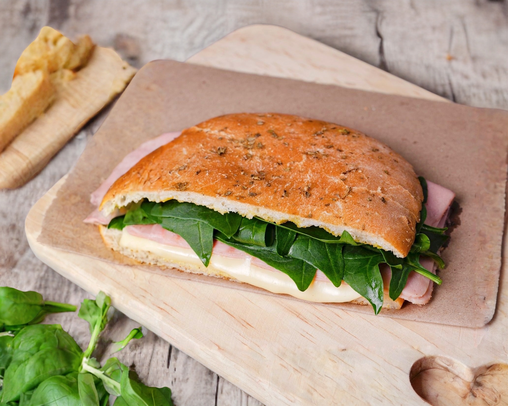 Pan de orégano, aderezo de la casa, jamón, queso manchego y espinaca