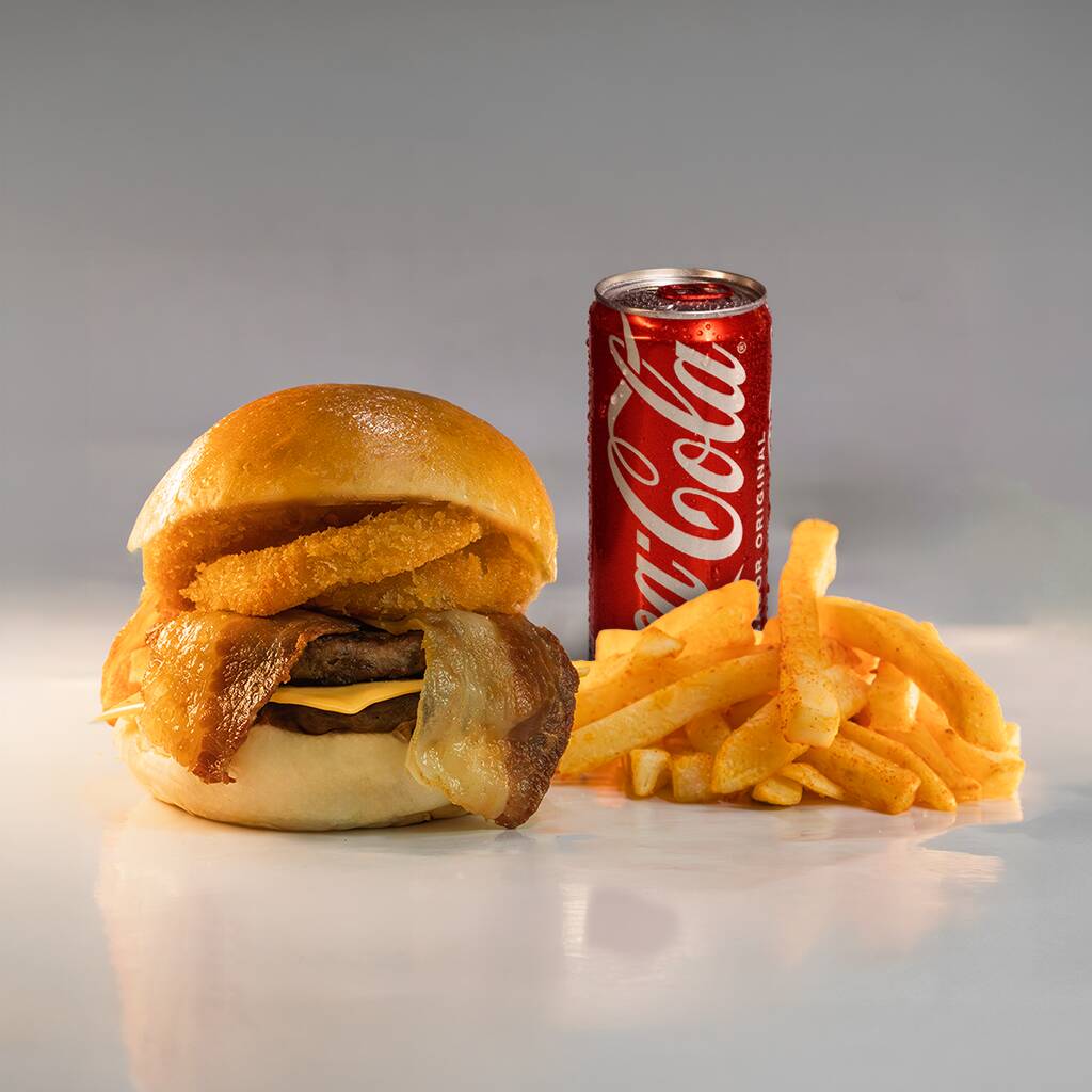 Doble carne gratis, sirloin, riquísimos aros de cebolla, tocino al grill, bañada en salsa BBQ y pan brioche, acompañada de 150 gramos de papas a la francesa.