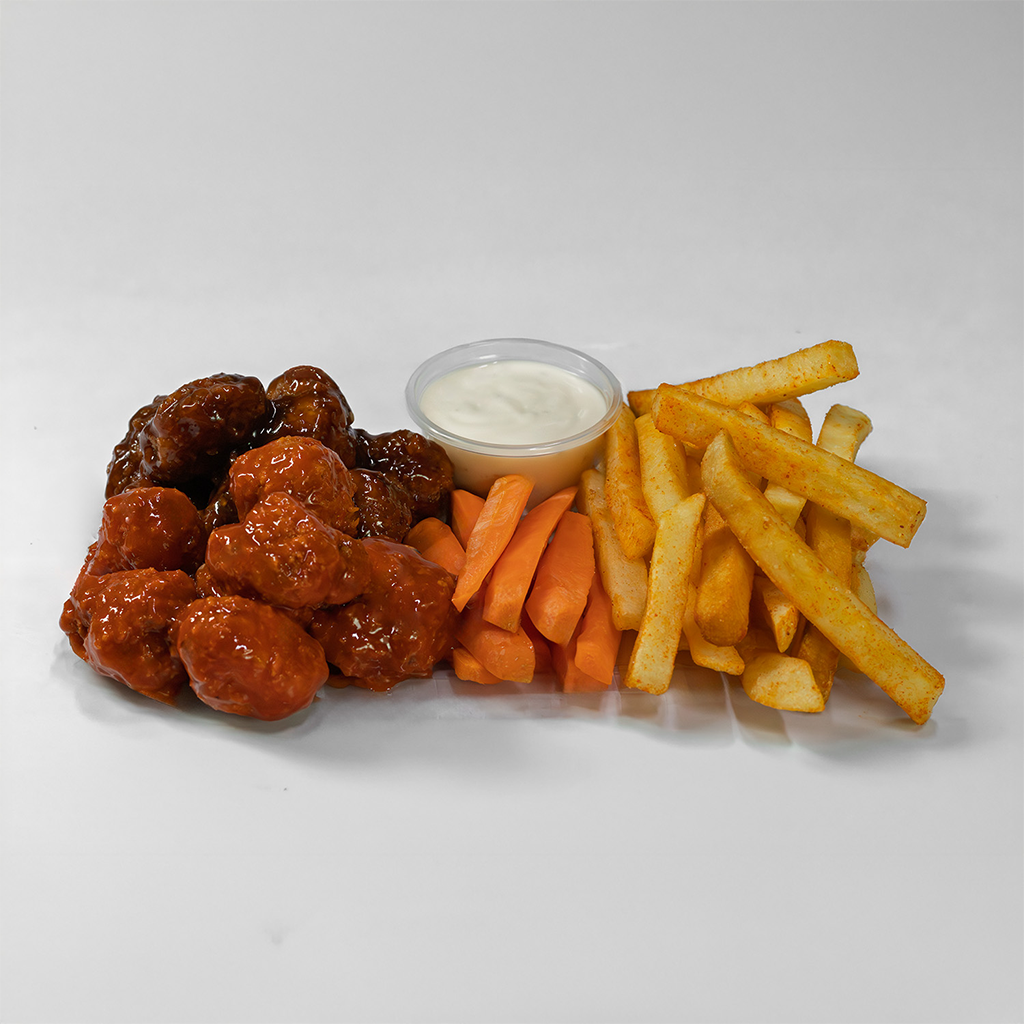 Boneless de pollo de 300 g, acompañados de 150 g de papas a la francesa, con aderezo ranch, bastones de zanahoria y dos salsas de tu elección.