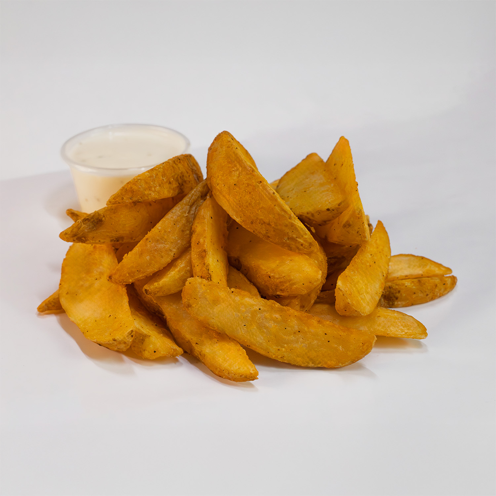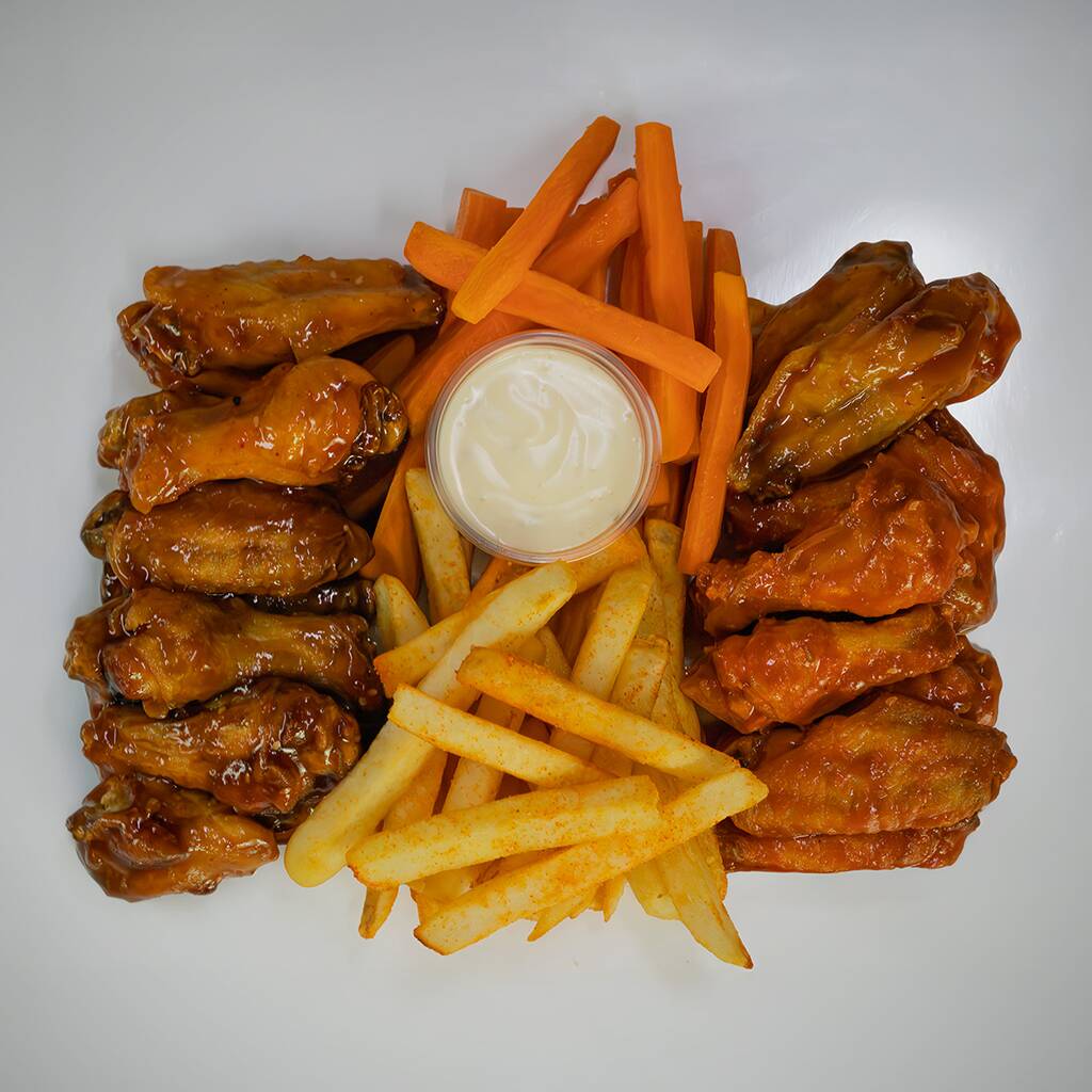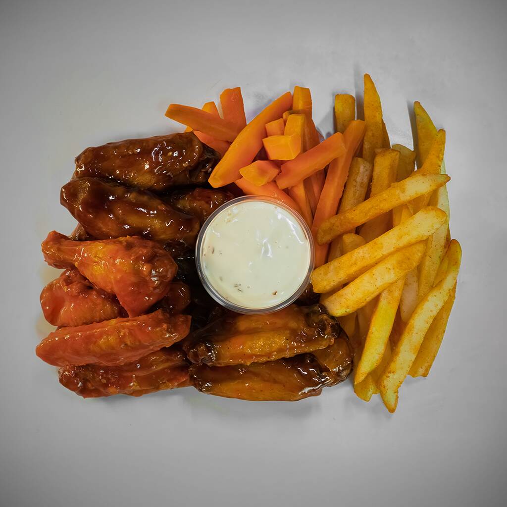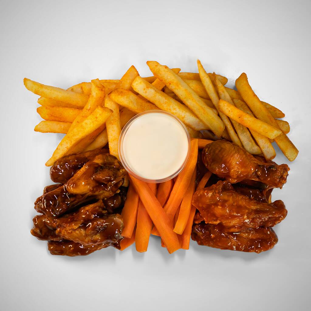 700 Gramos, acompañados de 150 gramos de papas a la francesa, incluye aderezo ranch, bastones de zanahoria y salsa de tu elección.