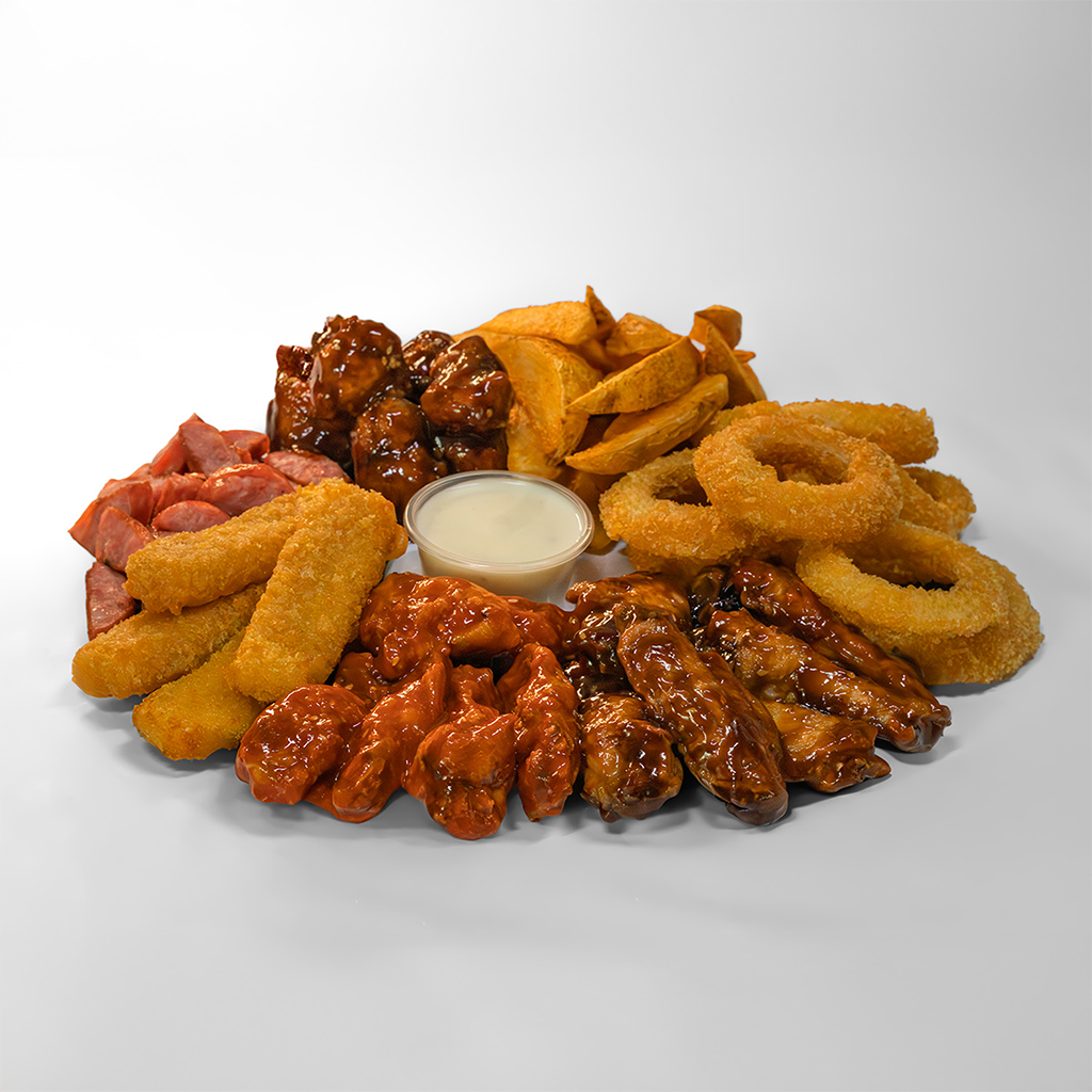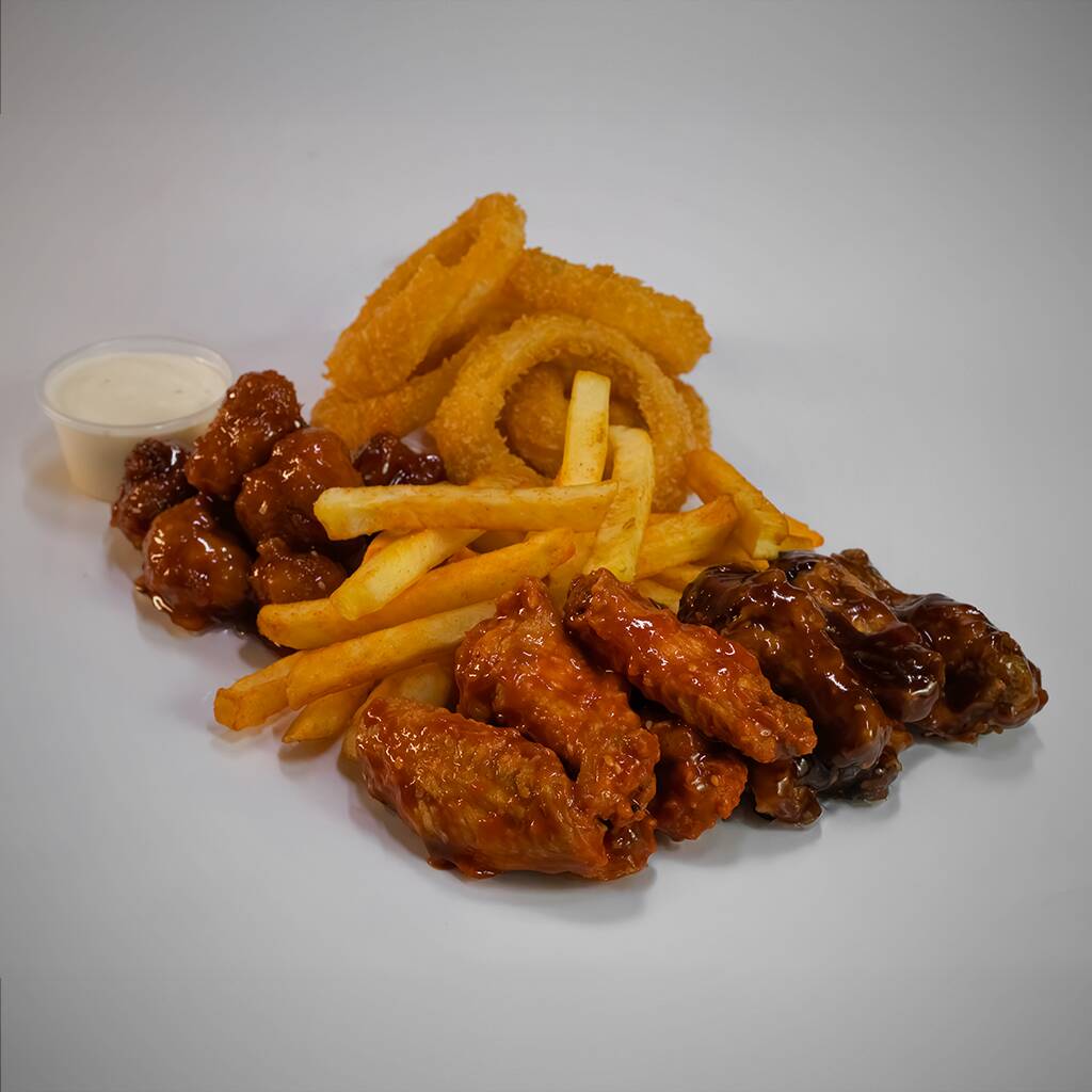 10 Alitas, media orden de boneless, papas sazonadas, aros de cebolla, dedos de queso, salchichas asadas, incluye aderezo ranch y salsa de tu elección.