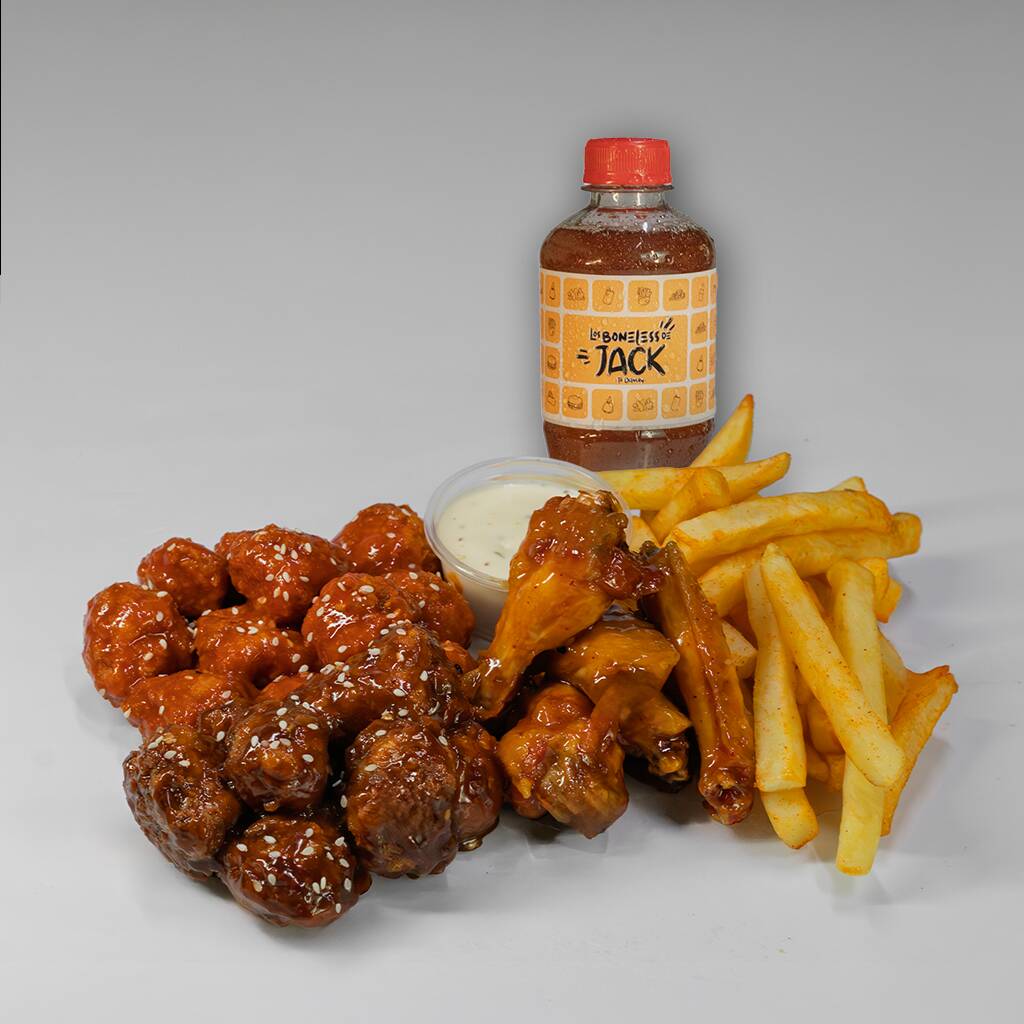 Té helado gratis, boneless personal, media orden de alitas, papas a la francesa; incluye aderezo ranch y salsa de tu elección.