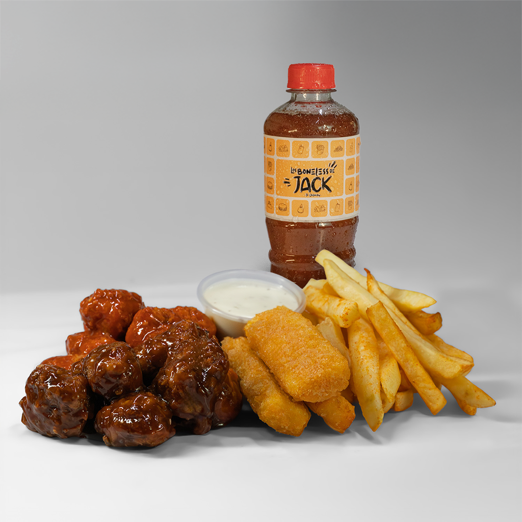 Té helado gratis, boneless personal, dedos de queso, papas a la francesa; incluye aderezo ranch y salsa de tu elección.