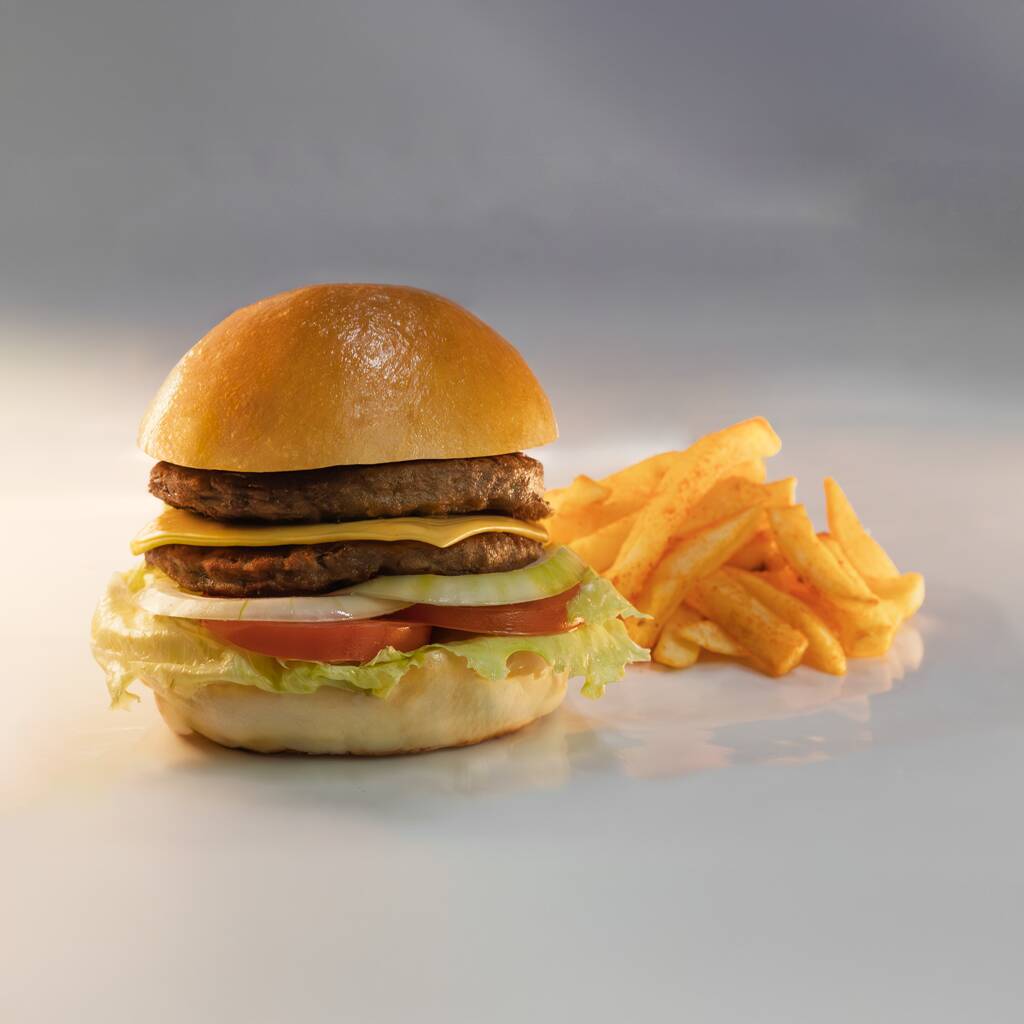 Doble carne gratis, sirloin, tomate, cebolla, lechuga y queso americano, acompañada de 150 gramos de papas a la francesa.