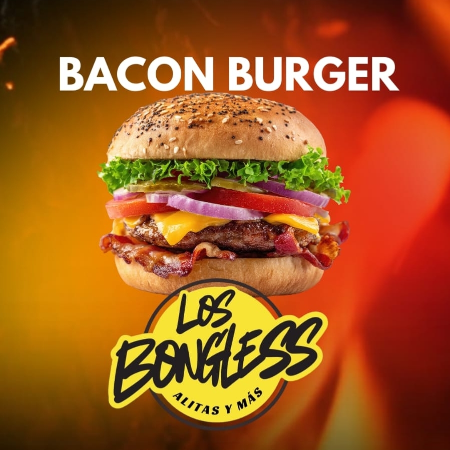 Carne 100% de res , tocino crujiente , cebolla caramelizada , pepiñillos,tomate, lechuga