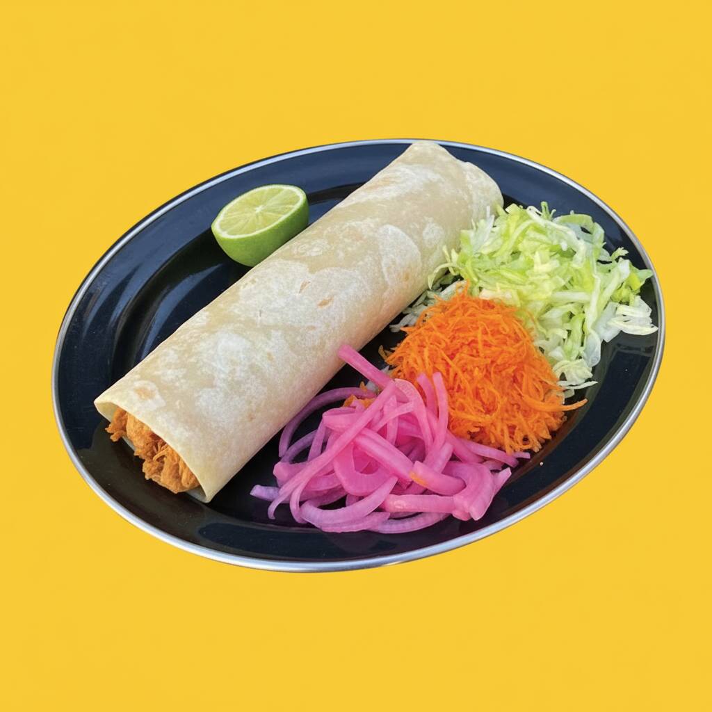Delicioso burrito de harina con carne pibil acompañado de lechuga, zanahoria y cebolla morada.