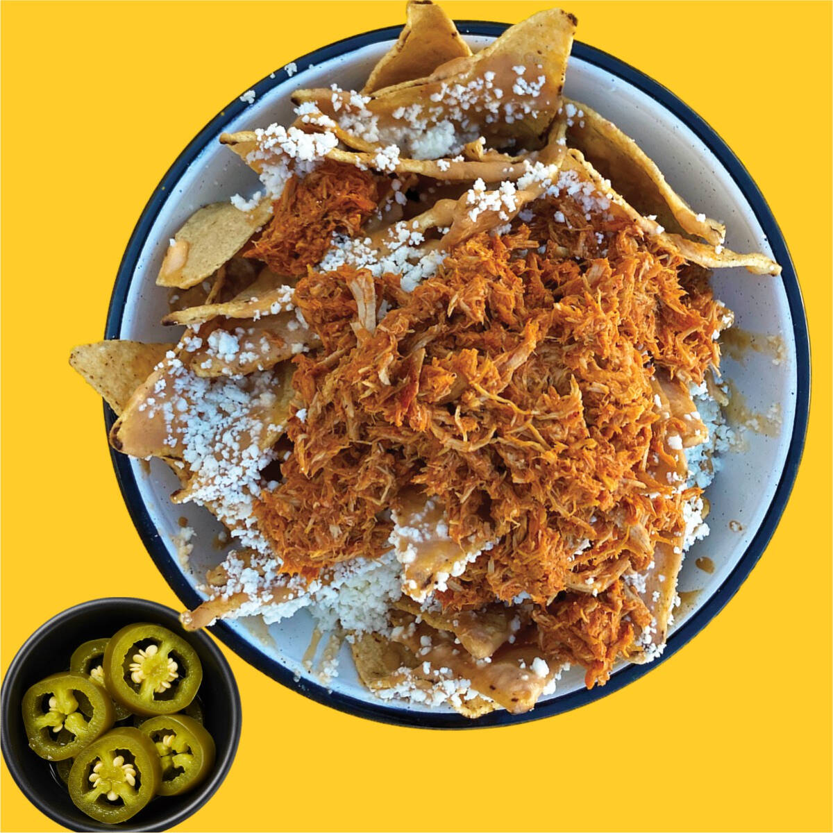 Deliciosos Nachos preparados con frijol puerco, queso amarillo, queso blanco rayado y carne pibíl. Incluye chiles jalapeños.