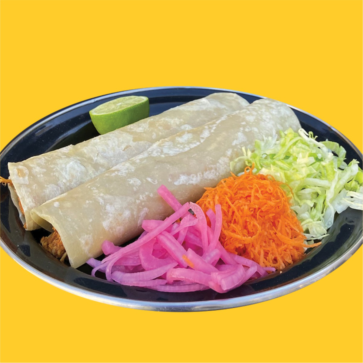 Delicioso Burrito de Harina con carne pibil acompañado de lechuga, zanahoria y cebolla morada.