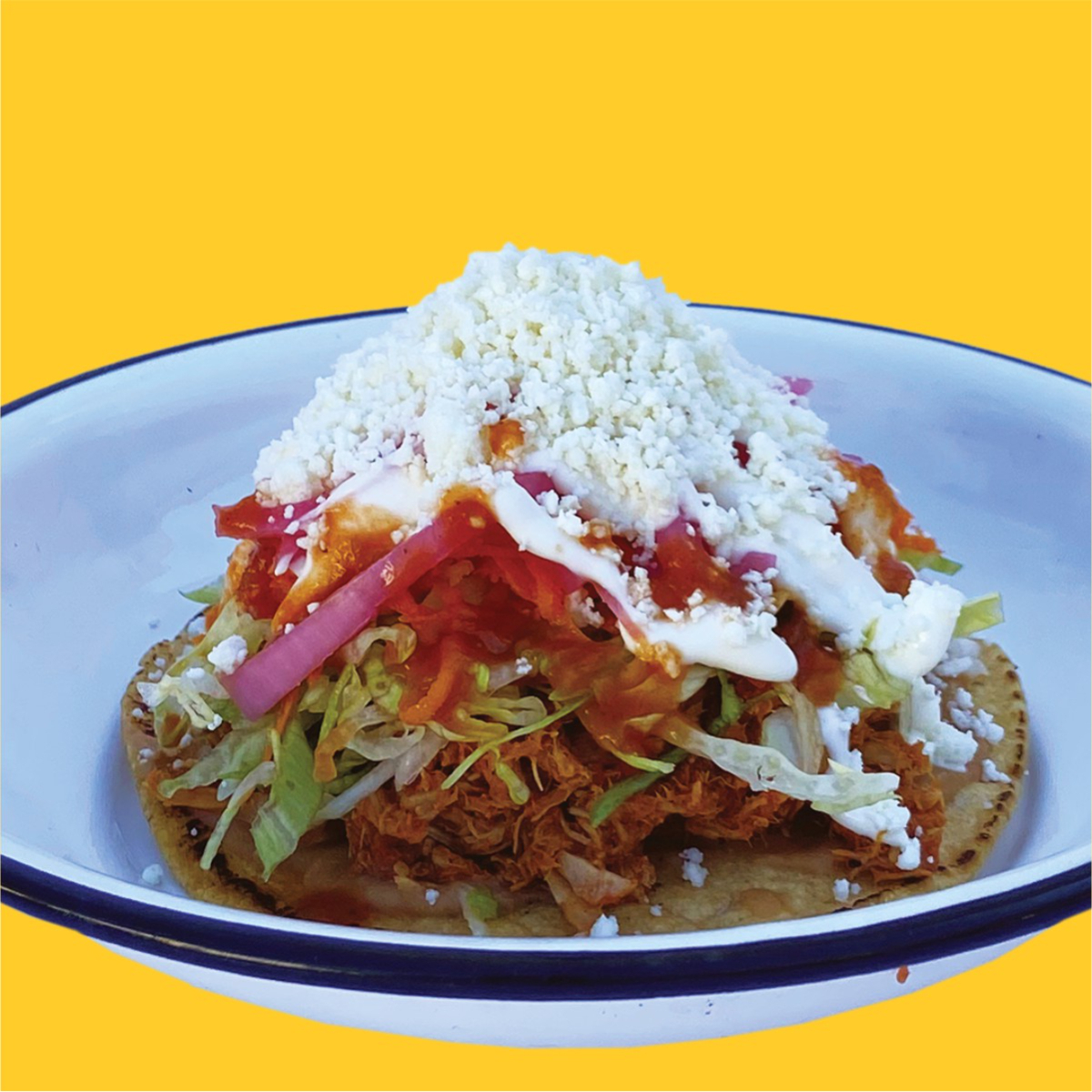 Deliciosa Tostada con carne pibíl, lechuga, cebolla morada, zanahoria rayada, salsa pace y queso rayado.
