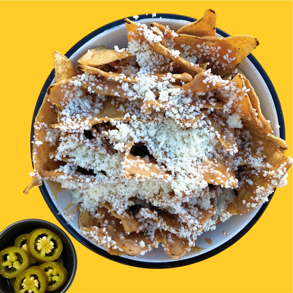 Nachos con frijol puerco, queso amarillo y queso blanco rayado. Incluye chiles jalapeños.