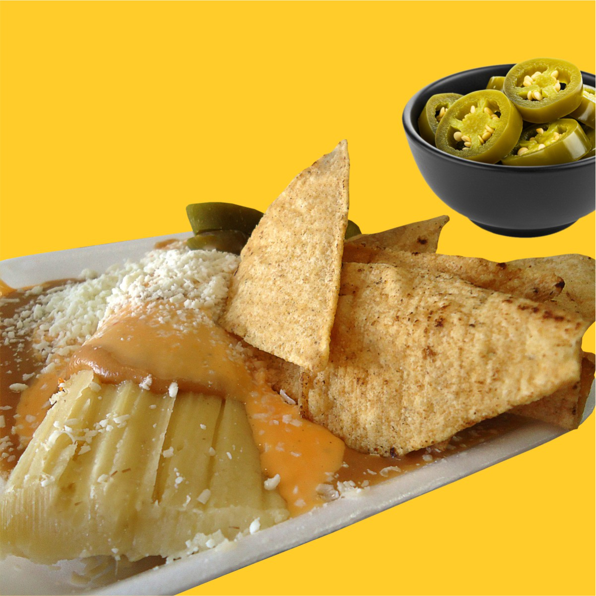 Delicioso Tamal bañado con frijol puerco, queso amarillo y queso blanco rayado. Incluye chiles jalapeños.