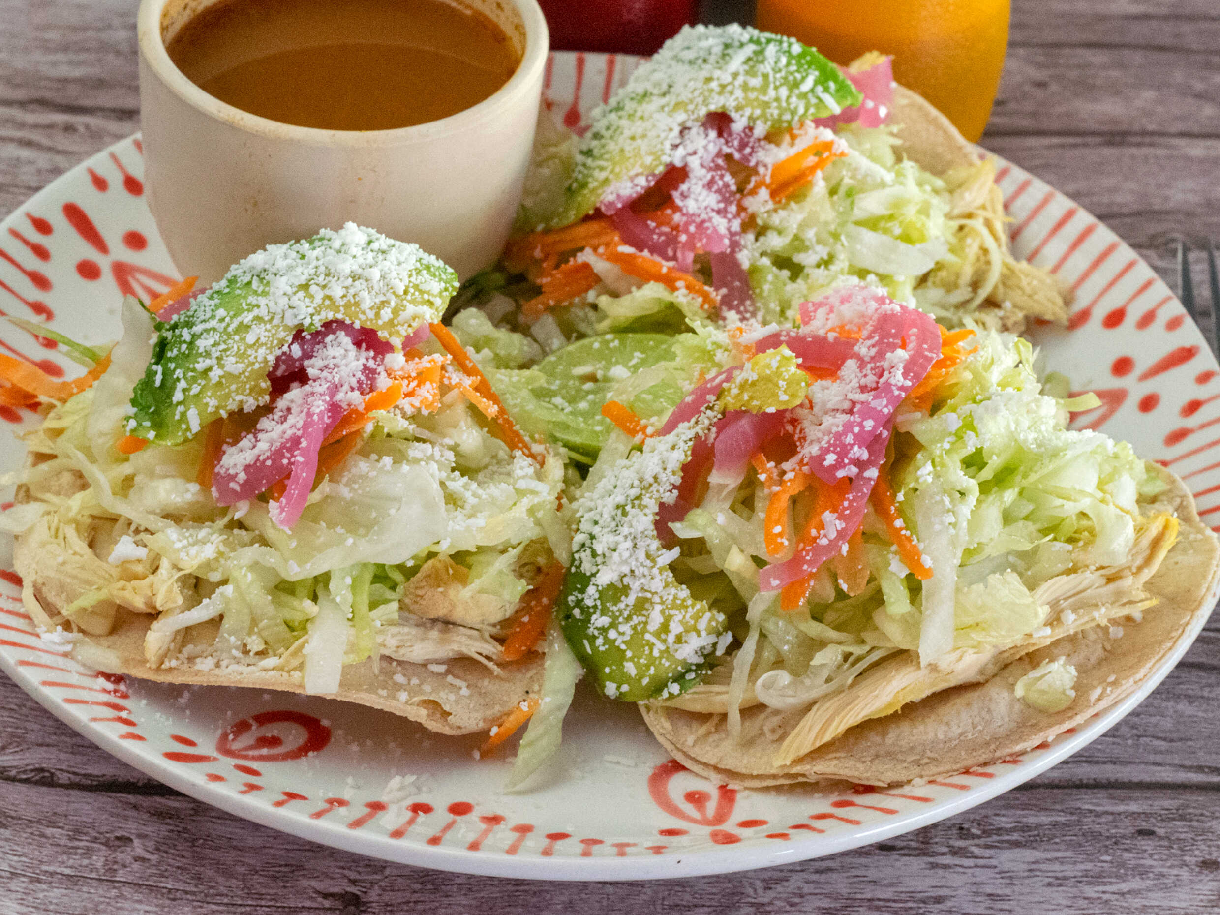 Tostadas de pollo o de res con frijol, lechuga, cebolla, tomate, y queso blanco con su consomé