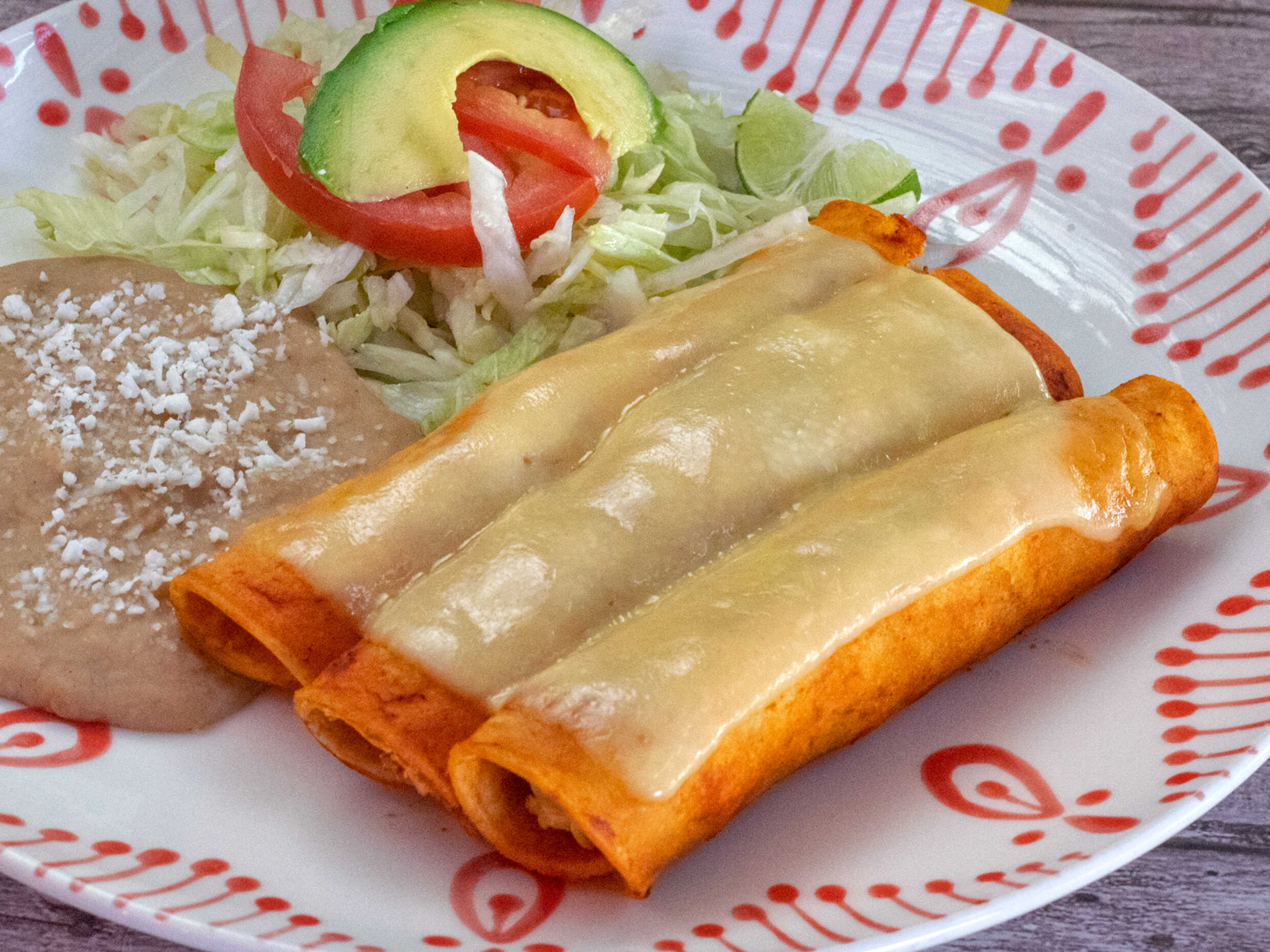 Tres enchiladas rojas de pollo, con queso gratinado, acompañado de frijol y verdura lechuga tomate, aguacate y limón