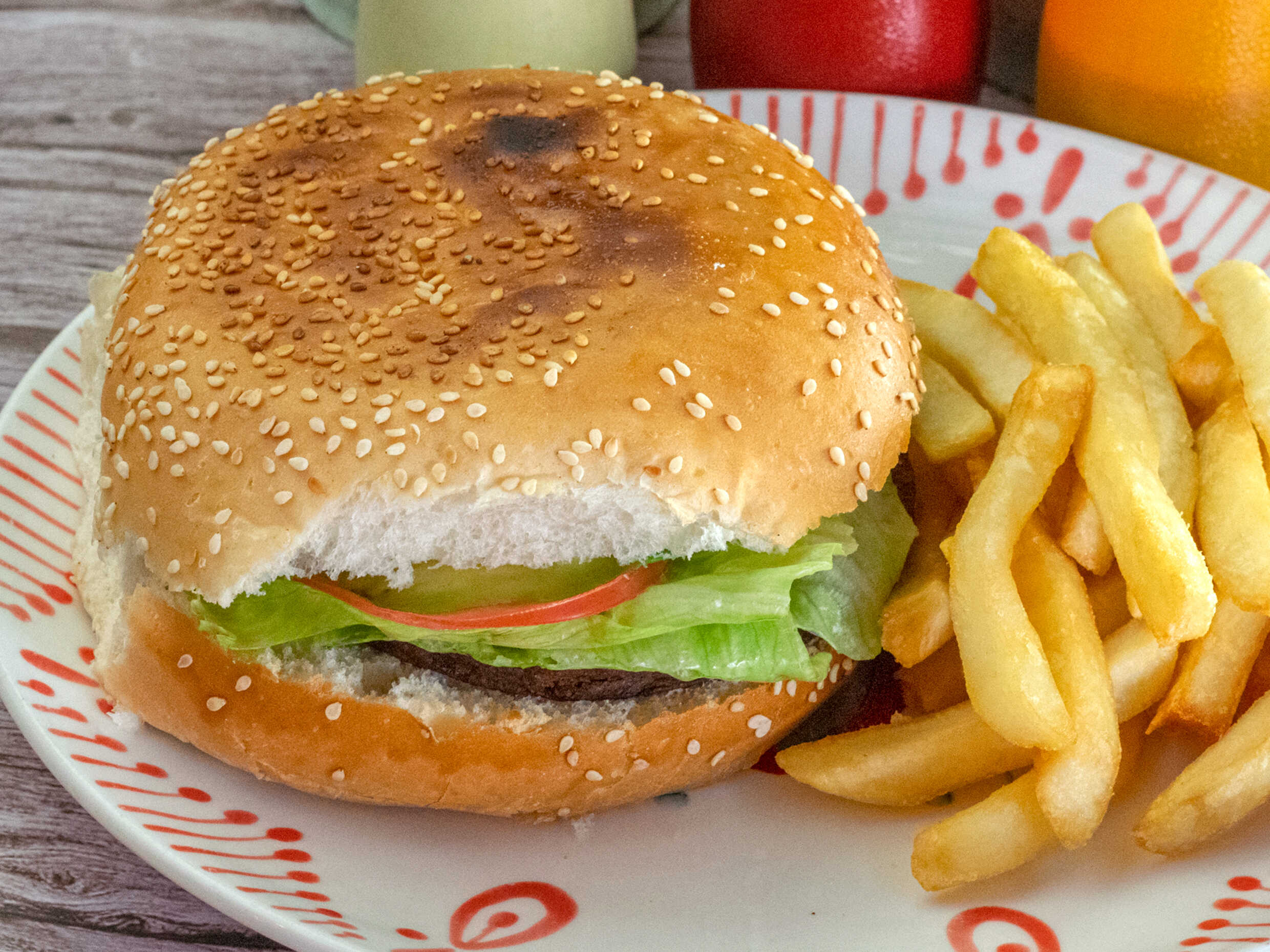 Hamburguesa de carne, con lechuga, tomate y aguacate, acompañado con papas