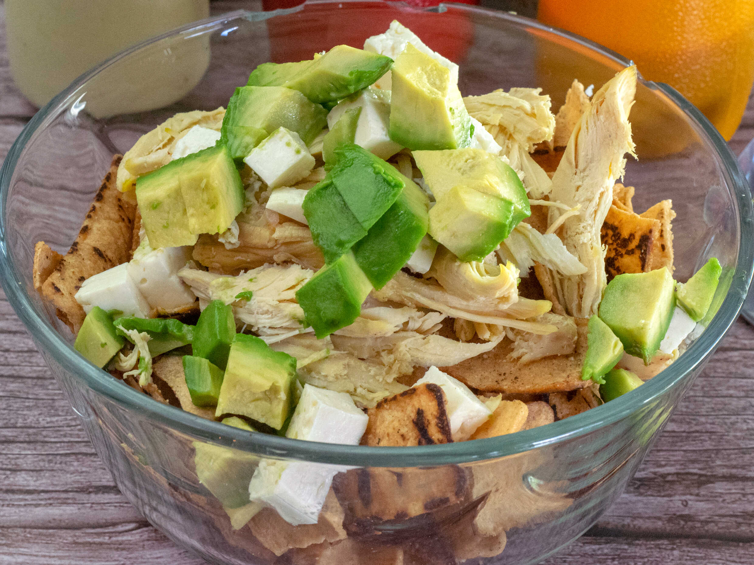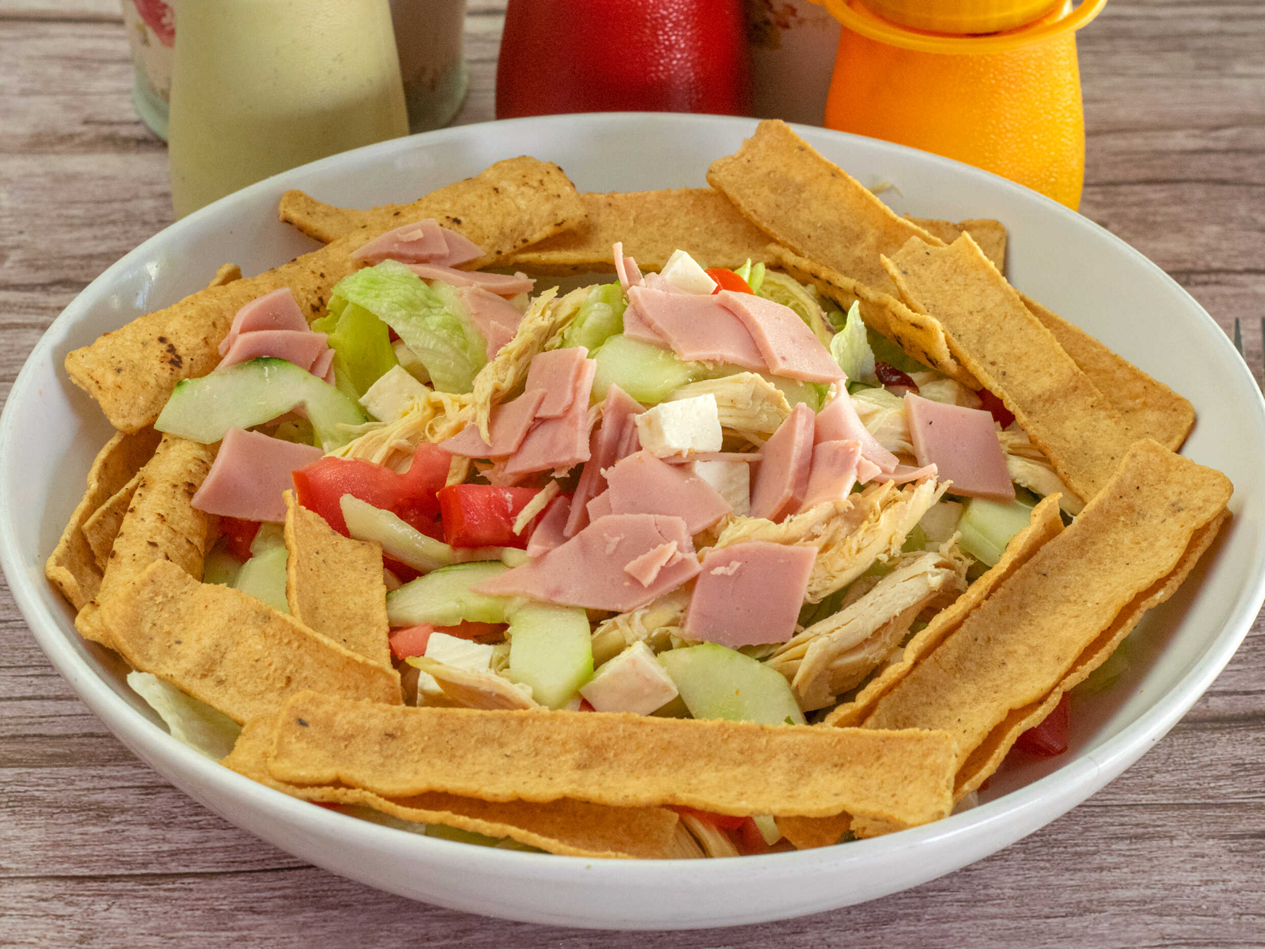 Lechuga, pepino, tomate, jícama, zanahoria rallada, queso panela, pollo, jamón y fajita de tortilla.