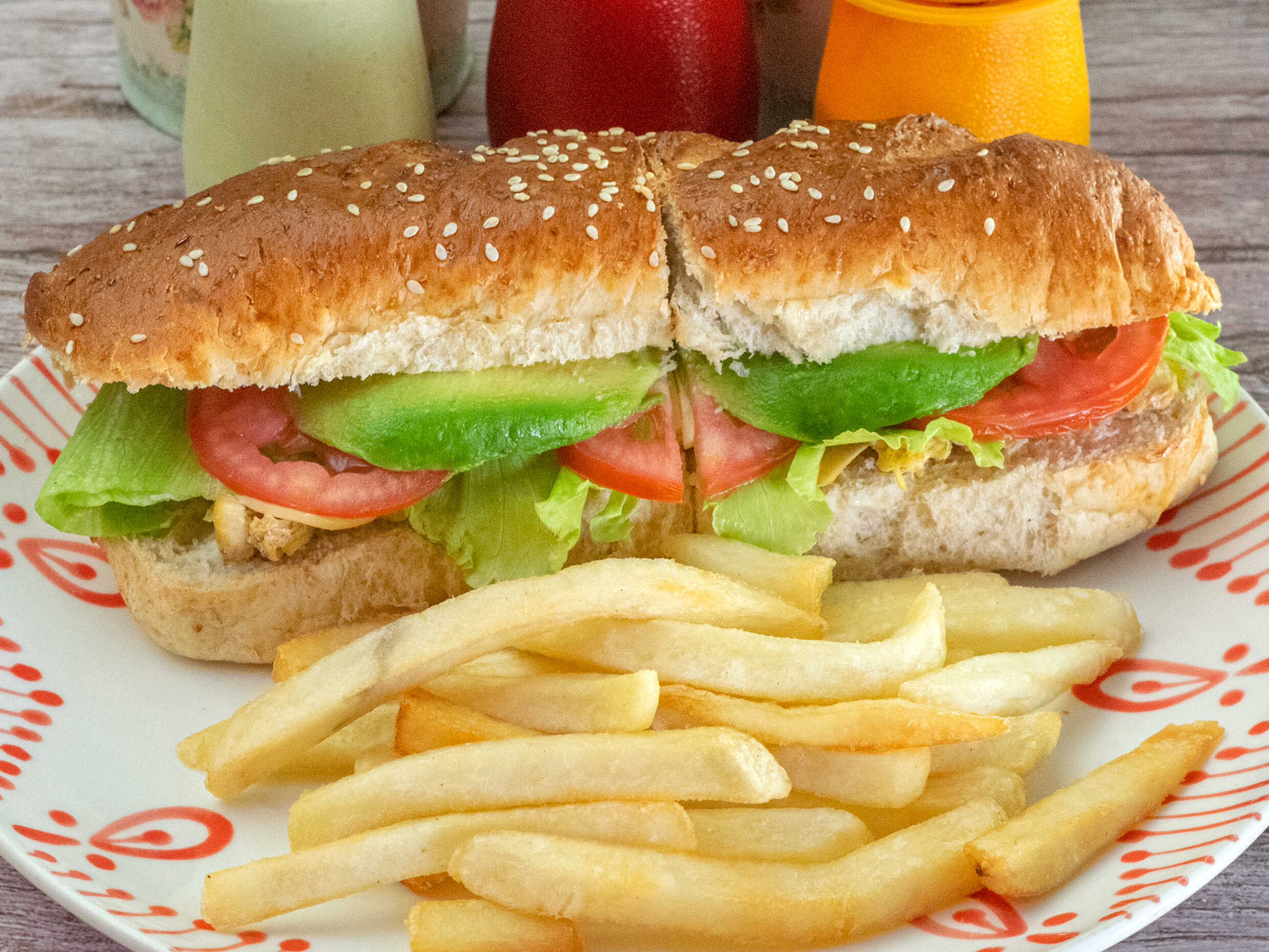 Torta de pollo con salsa BBQ y verdura lechuga, tomate y aguacate, acompañado de papas a la francesa