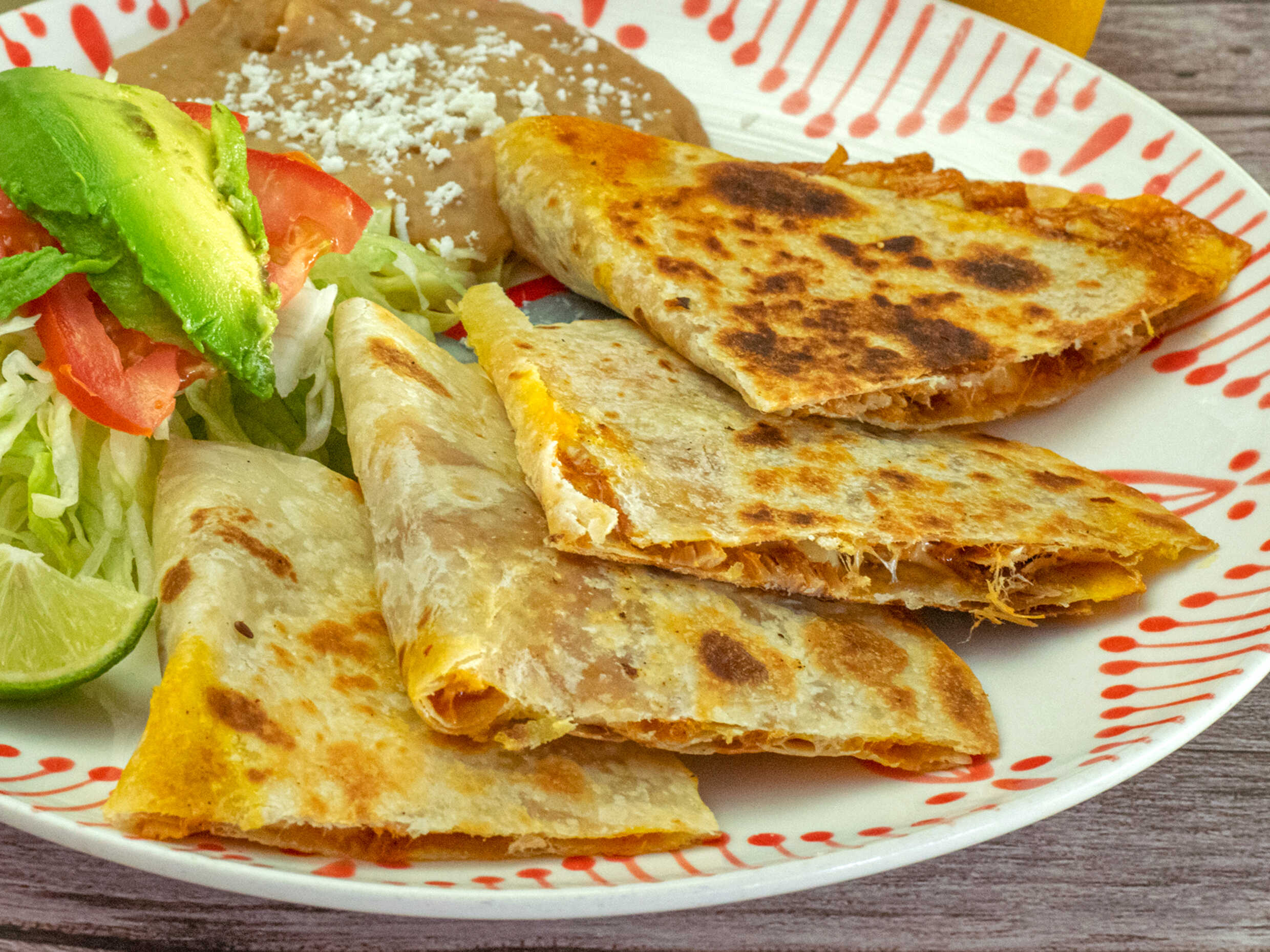 Dos sincronizadas de harina con queso y jamón, acompañado de frijol y verdura, lechuga, tomate y aguacate