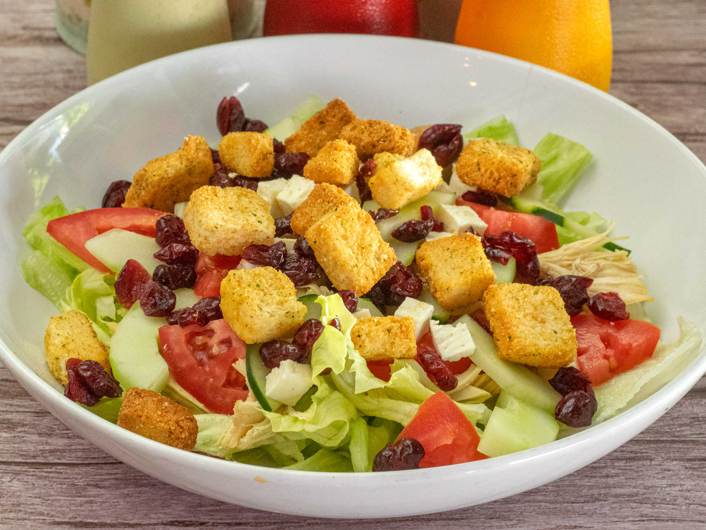 Lechuga, pepino, tomate, manzana verde, arándano, queso y pollo. Crotón italiano.