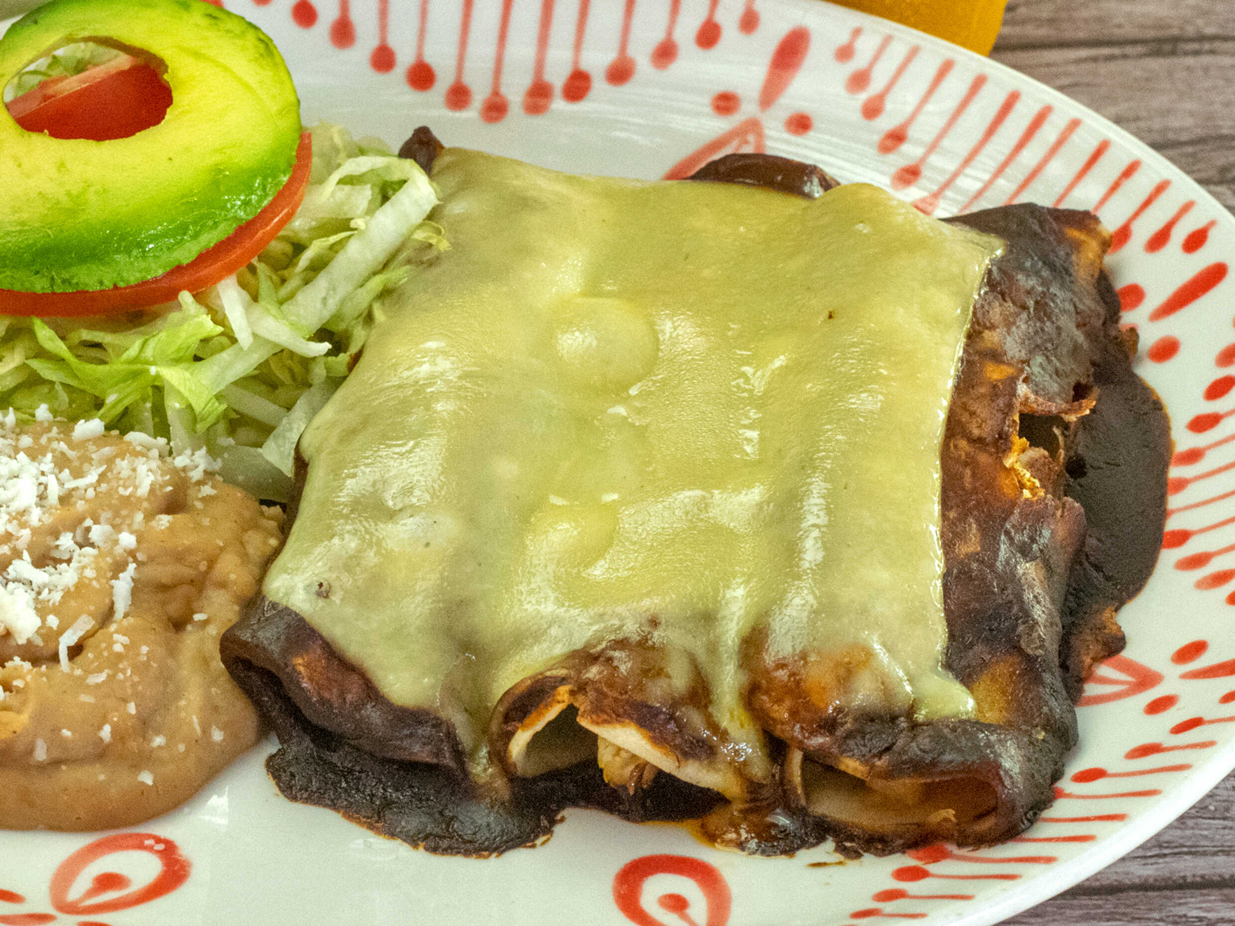 Tres enmoladas de pollo de salsa de mole, queso gratinado, acompañado de frijol, lechuga, y aguacate