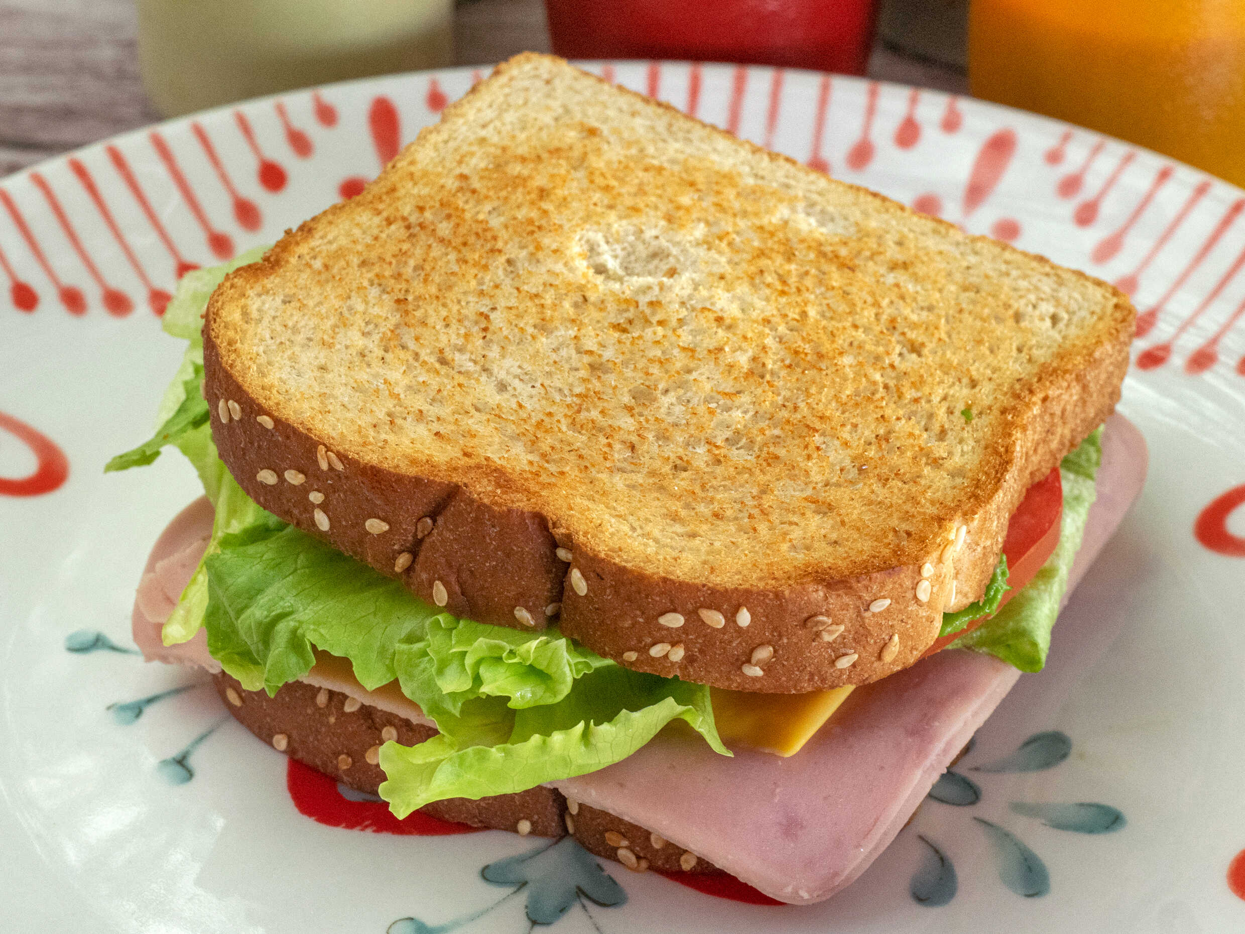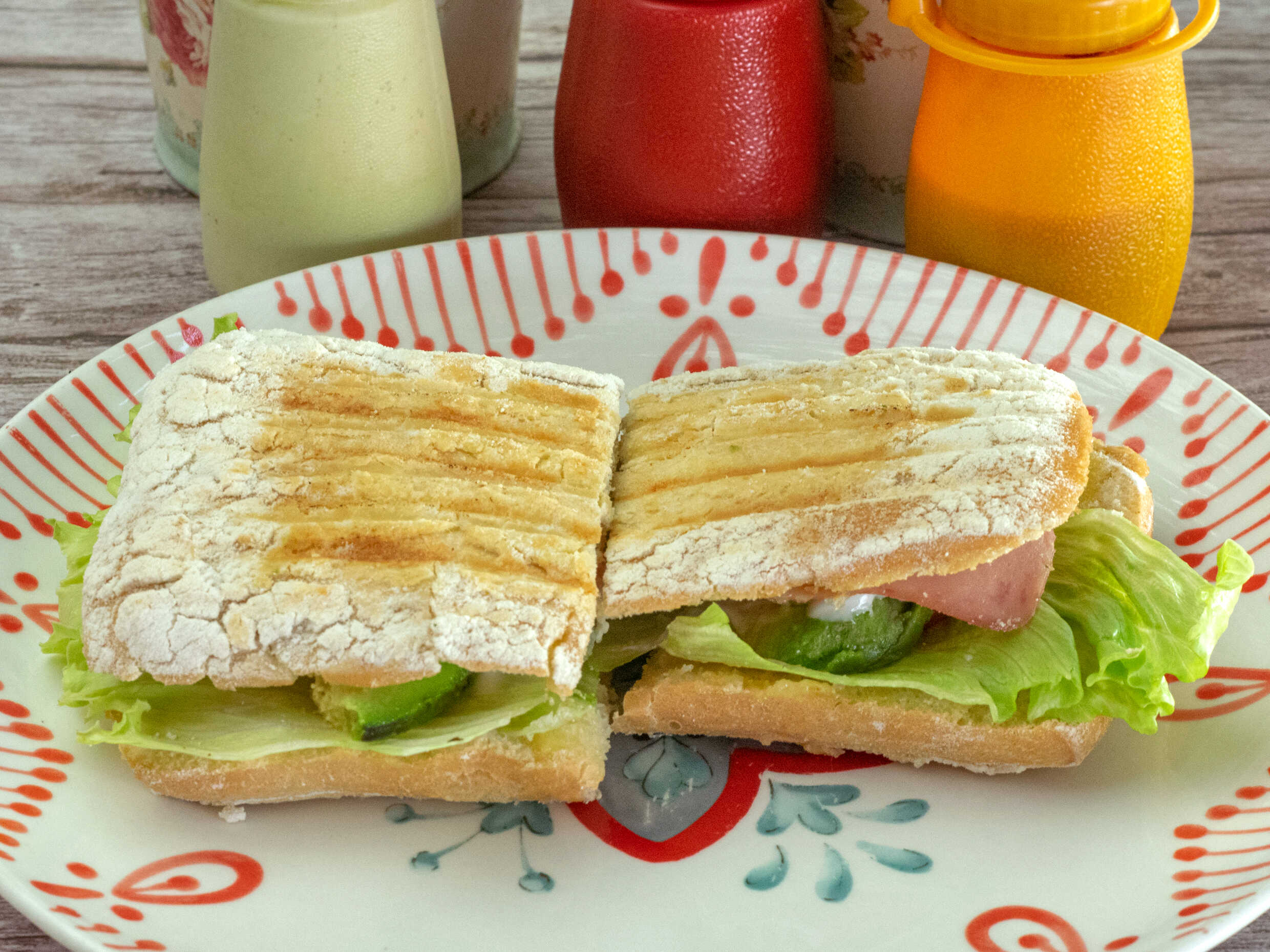Pan italiano con jamón y queso manchego, con verdura, lechuga, tomate y aguacate, acompañado con papas a la francesa