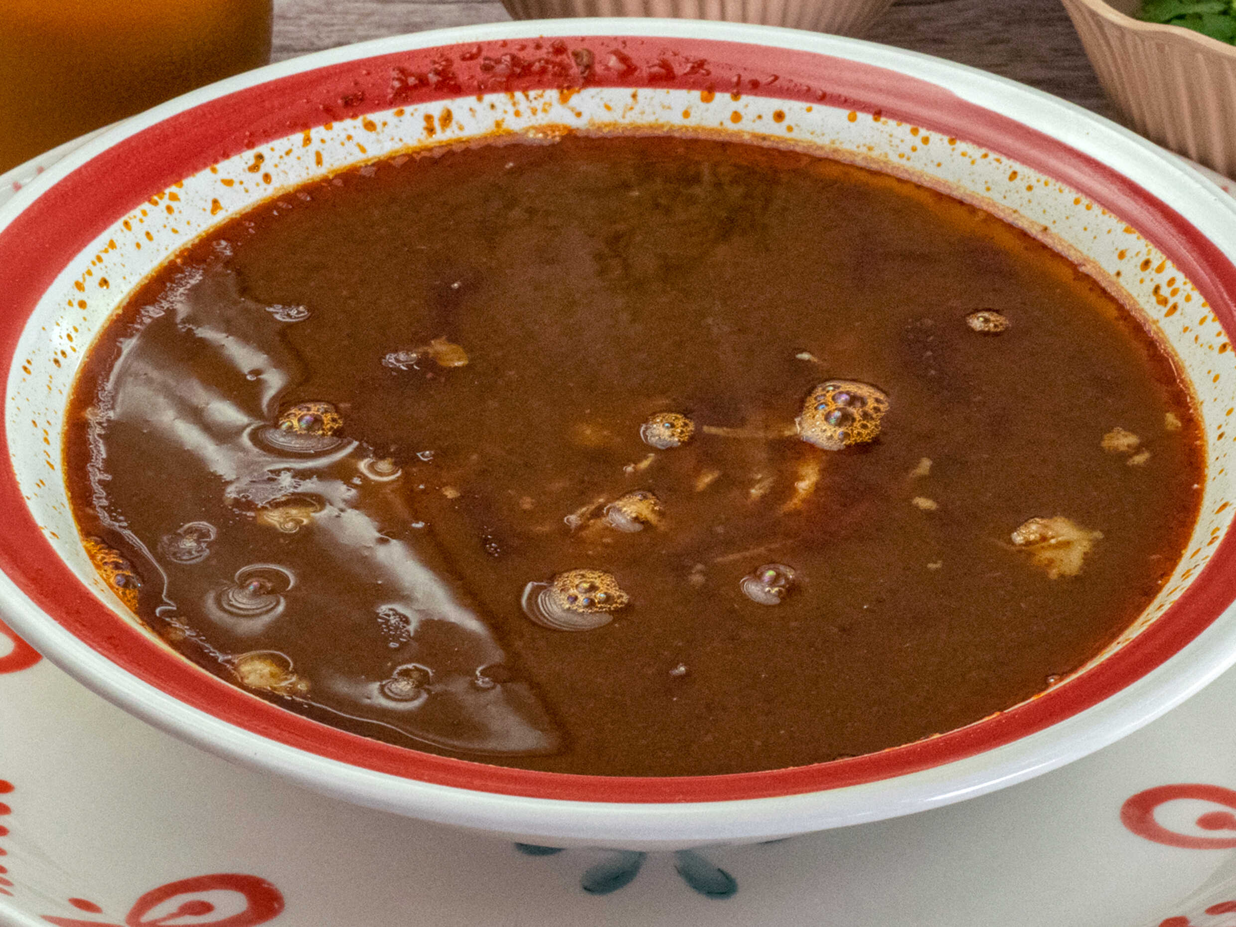 Orden de birria de res acompañada de tortillas, cilantro, cebolla y limón
