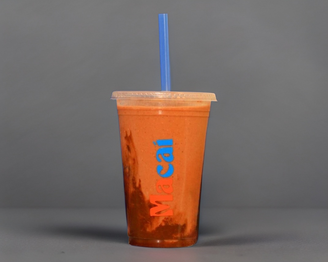 Smoothie de platano, leche de coco, chispas de chocolate s/a, cacao nibs, cocoa, granola, avena y datil, sin azucar.