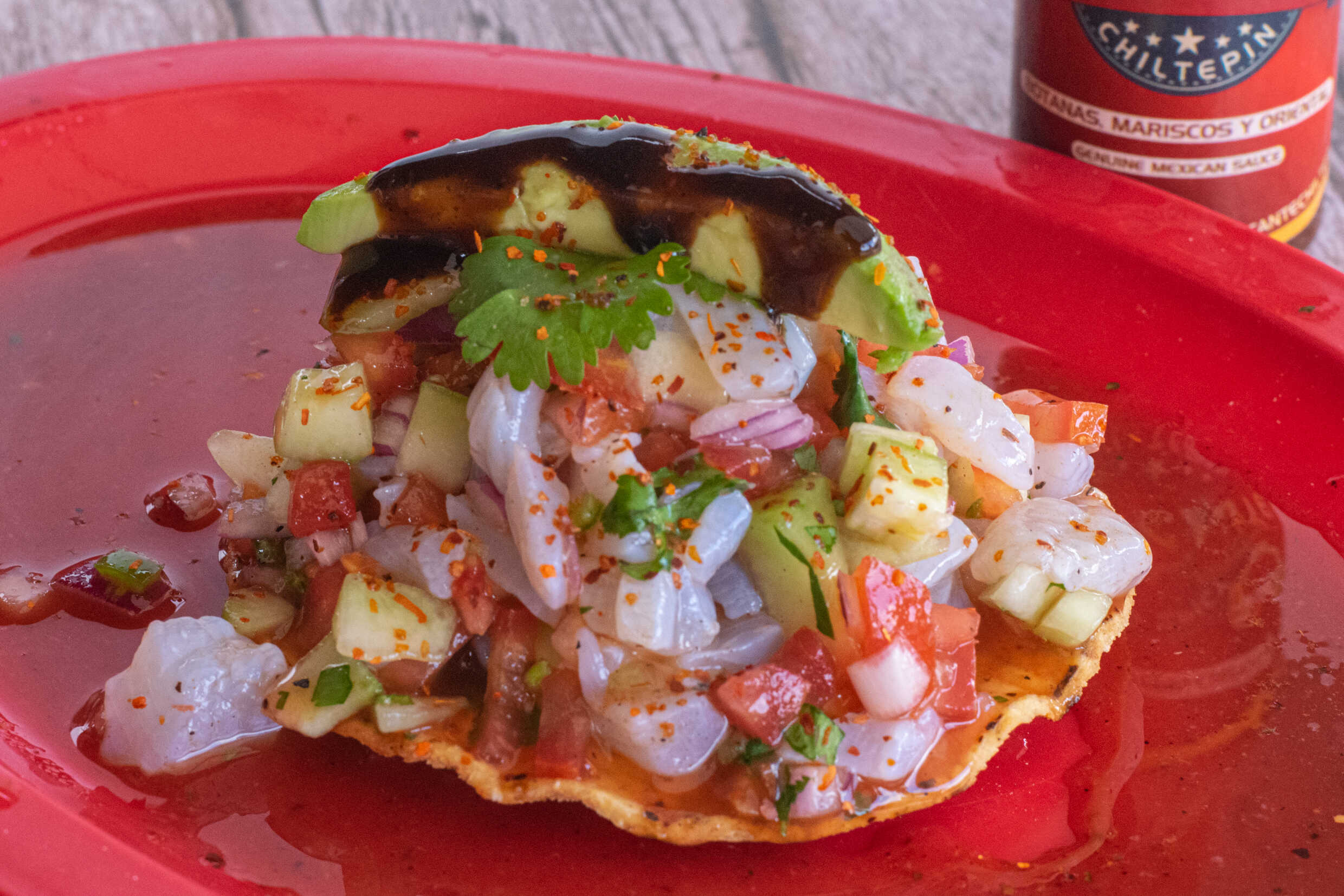 Tostada Embarazada = Ceviche de (mariscos mixtos)