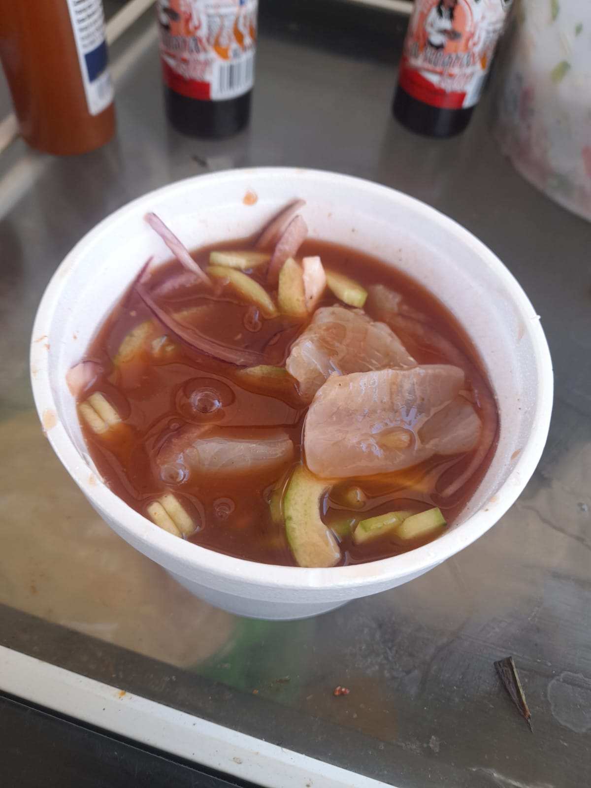 Pescado, con camaron picadito con pepino,cebolla morada,cilantro,tomate bañados en
