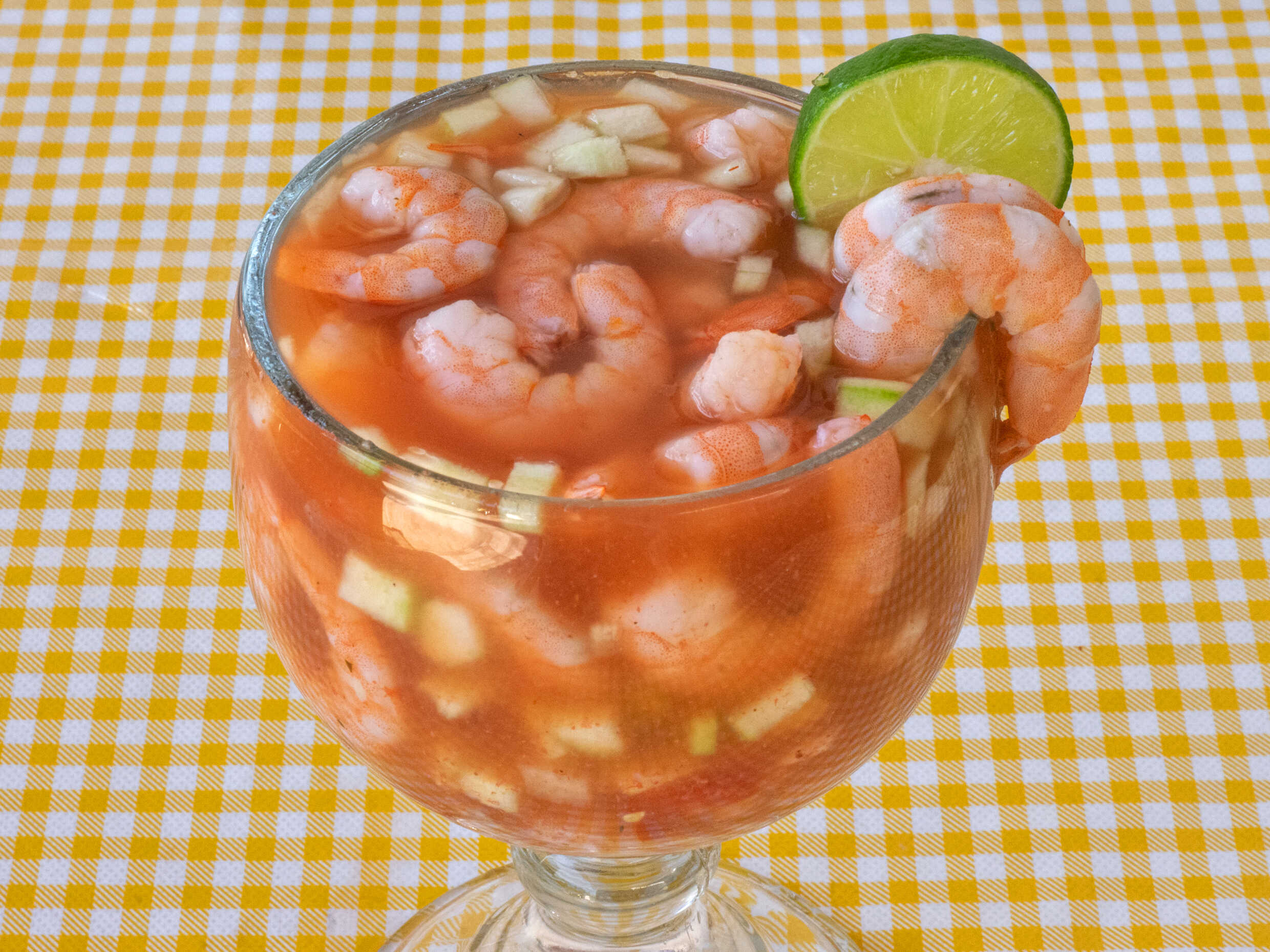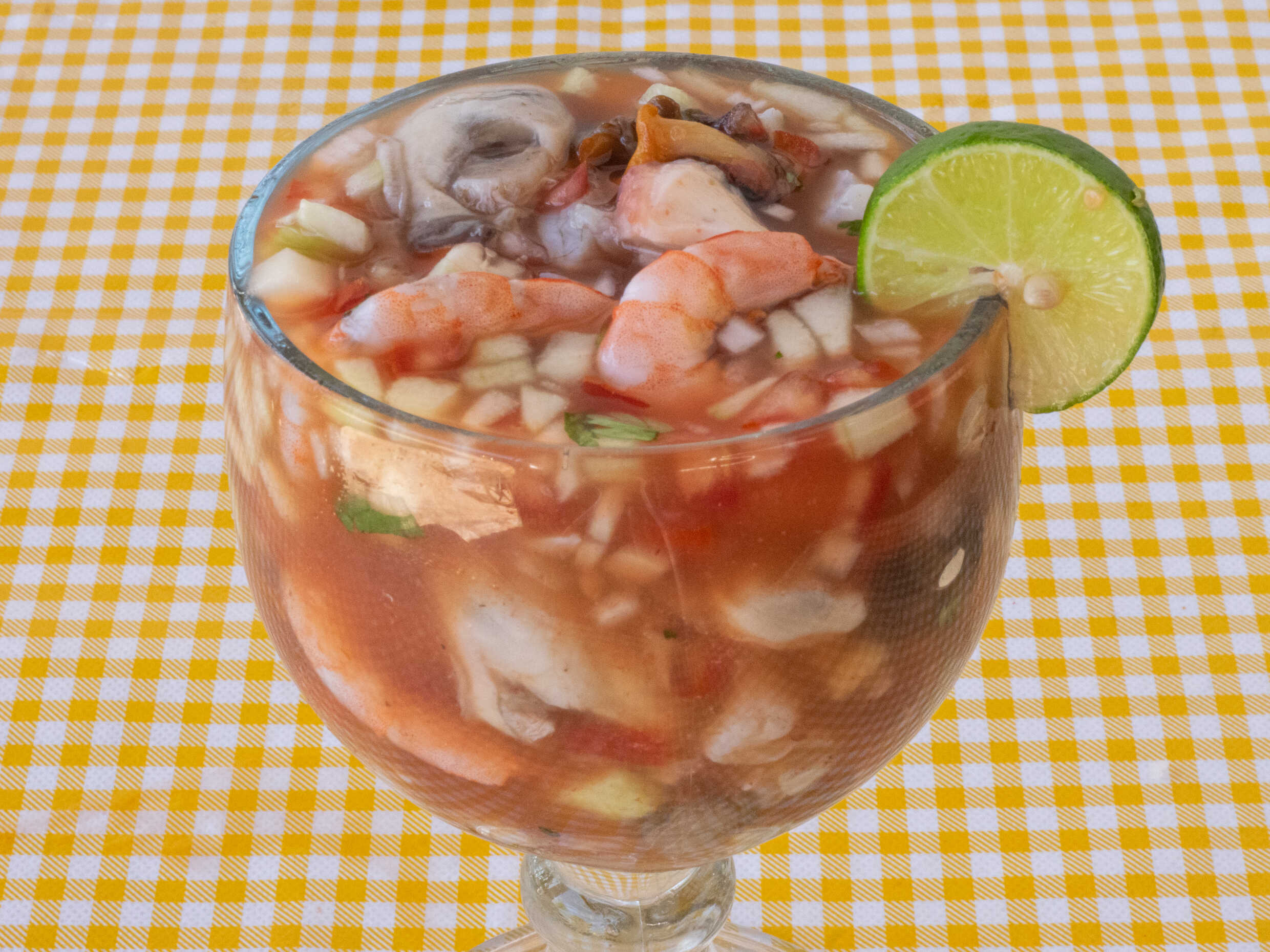 1/2 litro equivalente a una orden ceviche combinado de camarón crudo, camarón cosido, pulpo y pescado curtido en limon y caldo de camarón salseado con pepino, cebolla morada, tomate y cilantro (no incluye aguacate)