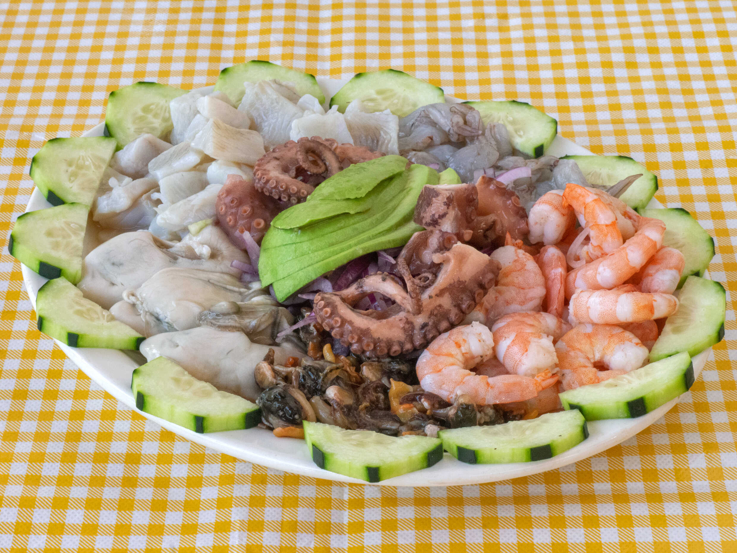 Camarón, pulpo, ostión, almeja y ceviche de pescado.