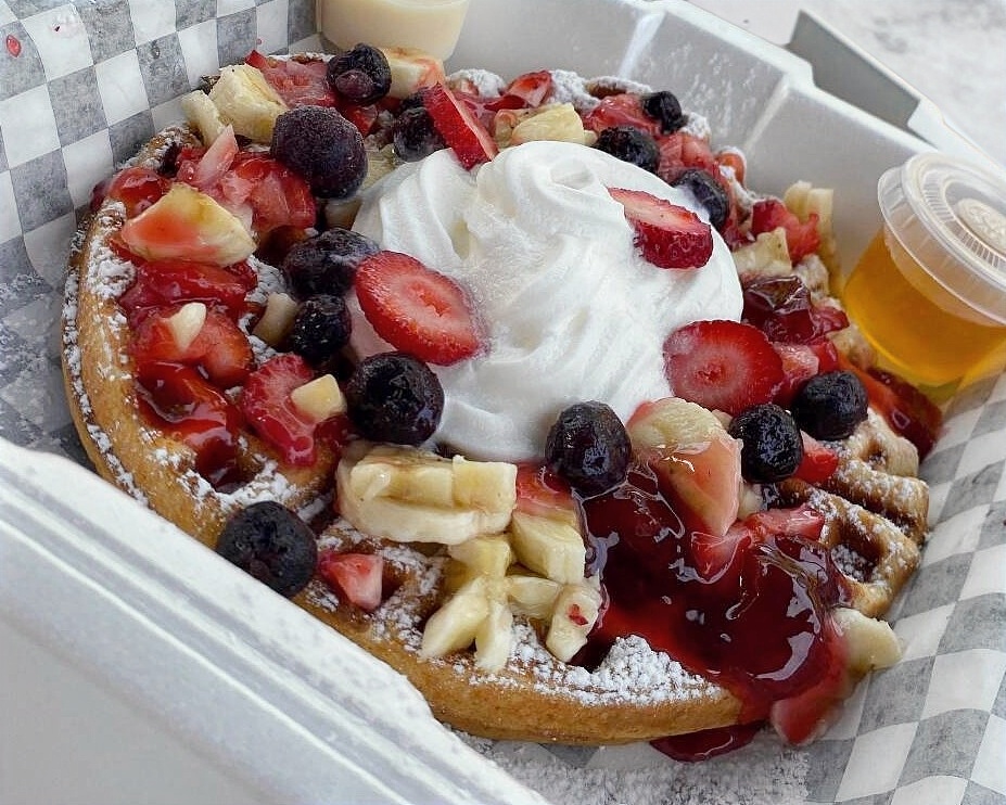 harina, leche, azucar glaciada, mermelada, fresas, platano, arandano, crema batida, miel mapple y lecherita