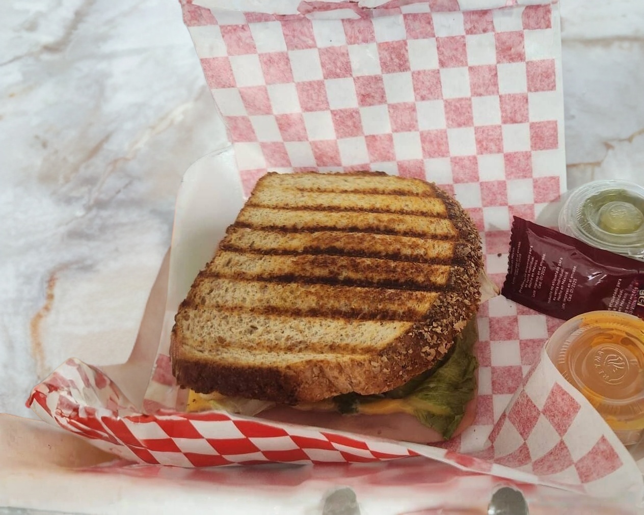 Pan integra, jamon, queso americano, lechuga, tomate, mantequilla y mayonesa