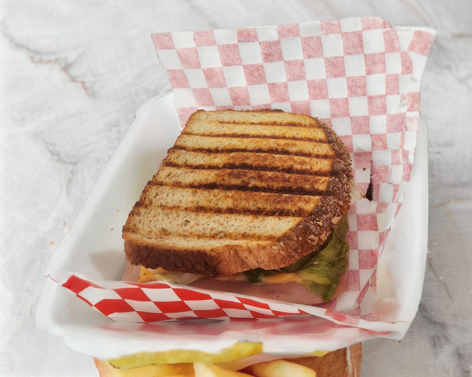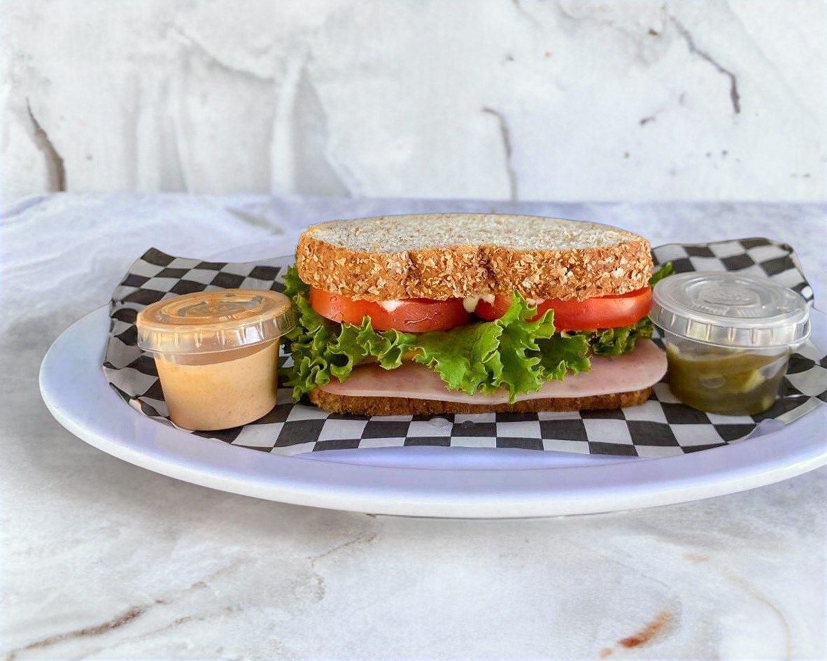 Pan integral, jamon, queso americano, lechuga, tomate y mayonesa