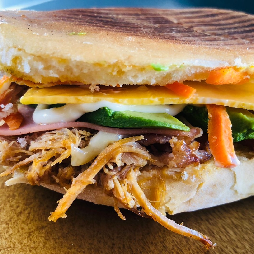 Carne de puerco, jamón, queso americano, cebolla, zanahoria, aguacate y mayonesa