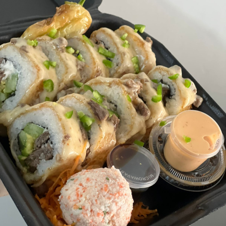 Rollo empanizado, por dentro alga, res, aguacate, pepino, philadelphia, con topping de queso gratinado, res, aderezho y chile serrano