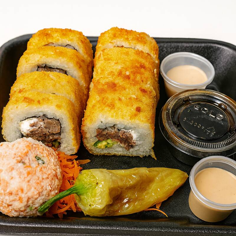 Rollo empanizado por dentro res, aguacate, philadelphia, pepino con toping de ensalada tampico + 1 te