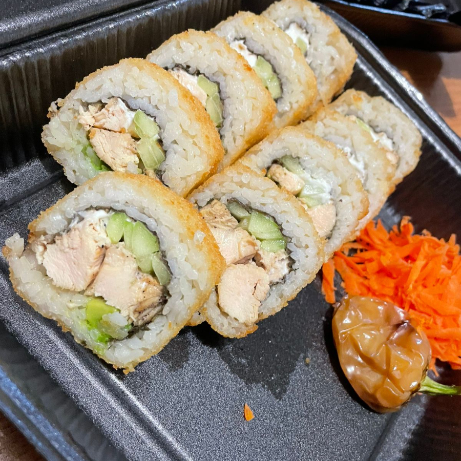 Rollo empanizado por dentro pollo, aguacate, philadelphia, pepino con toping de ensalada tampico + 1 te