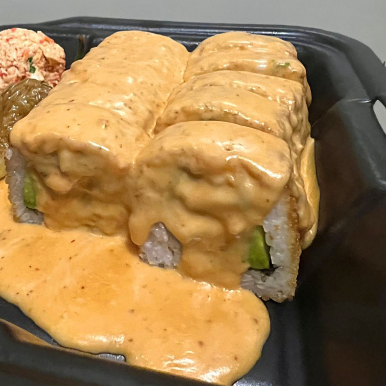 Rollo empanizado por dentro surimi, aguacate, philadelphia, pepino con toping de ensalada tampico + 1 te