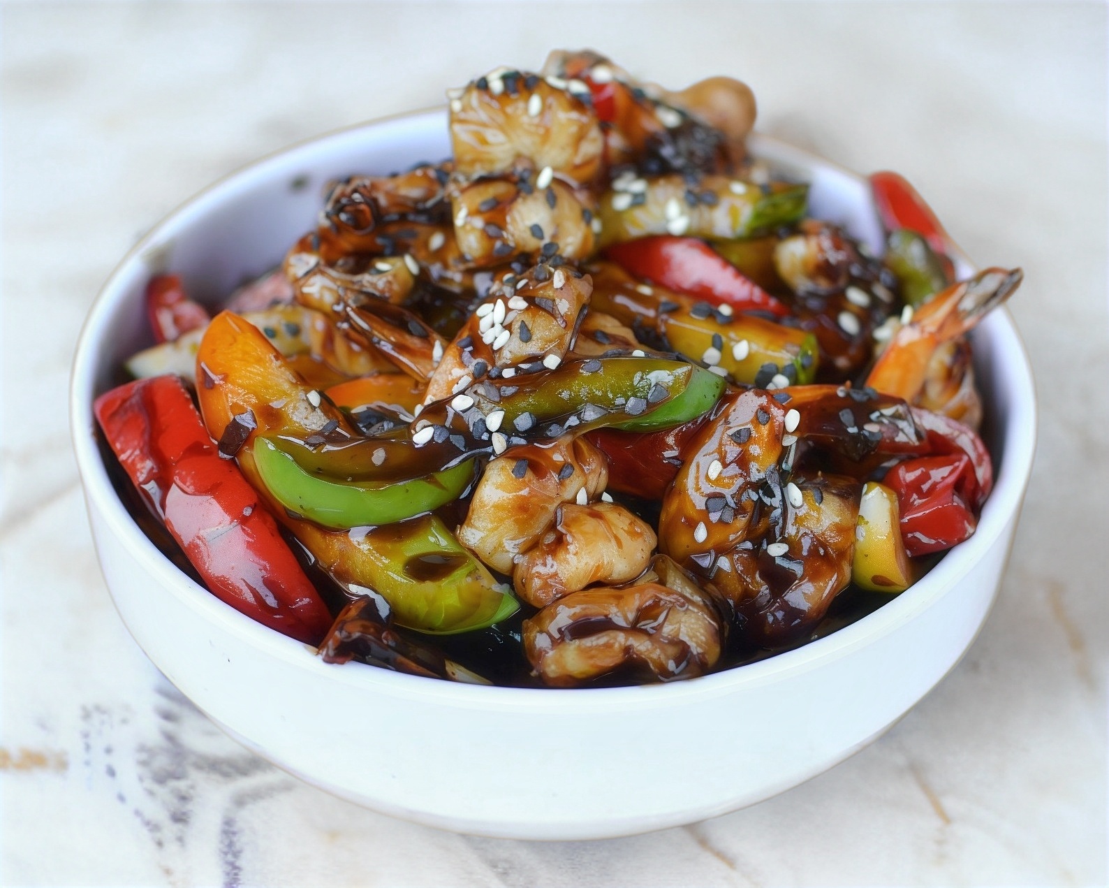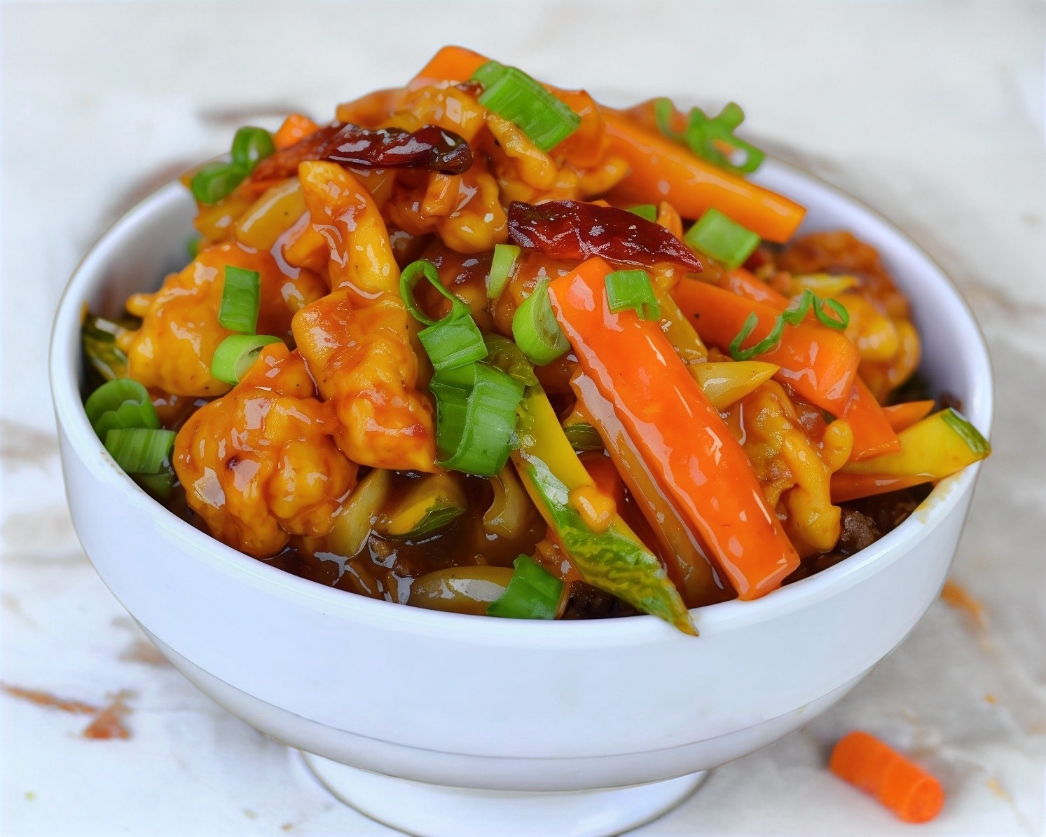 Cebolla, zanahoria, calabaza, chile de árbol, salsa agridulce con un toque de picor y arroz a elegir blanco o frito.