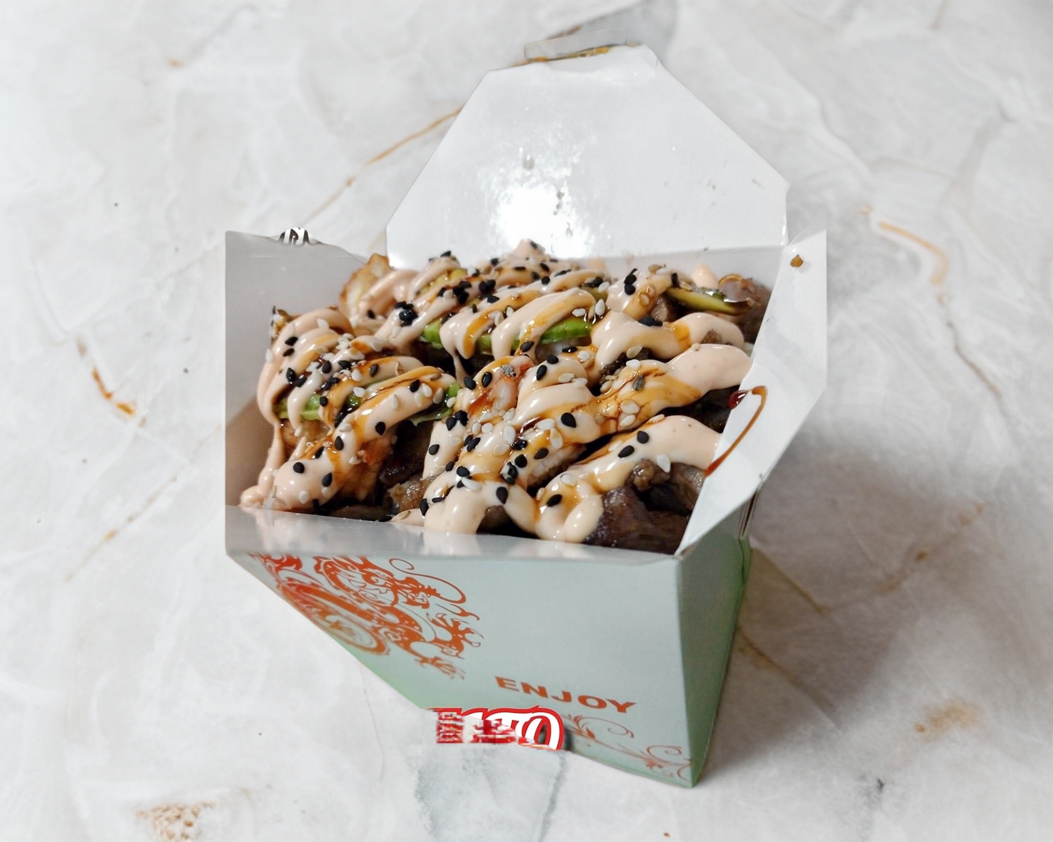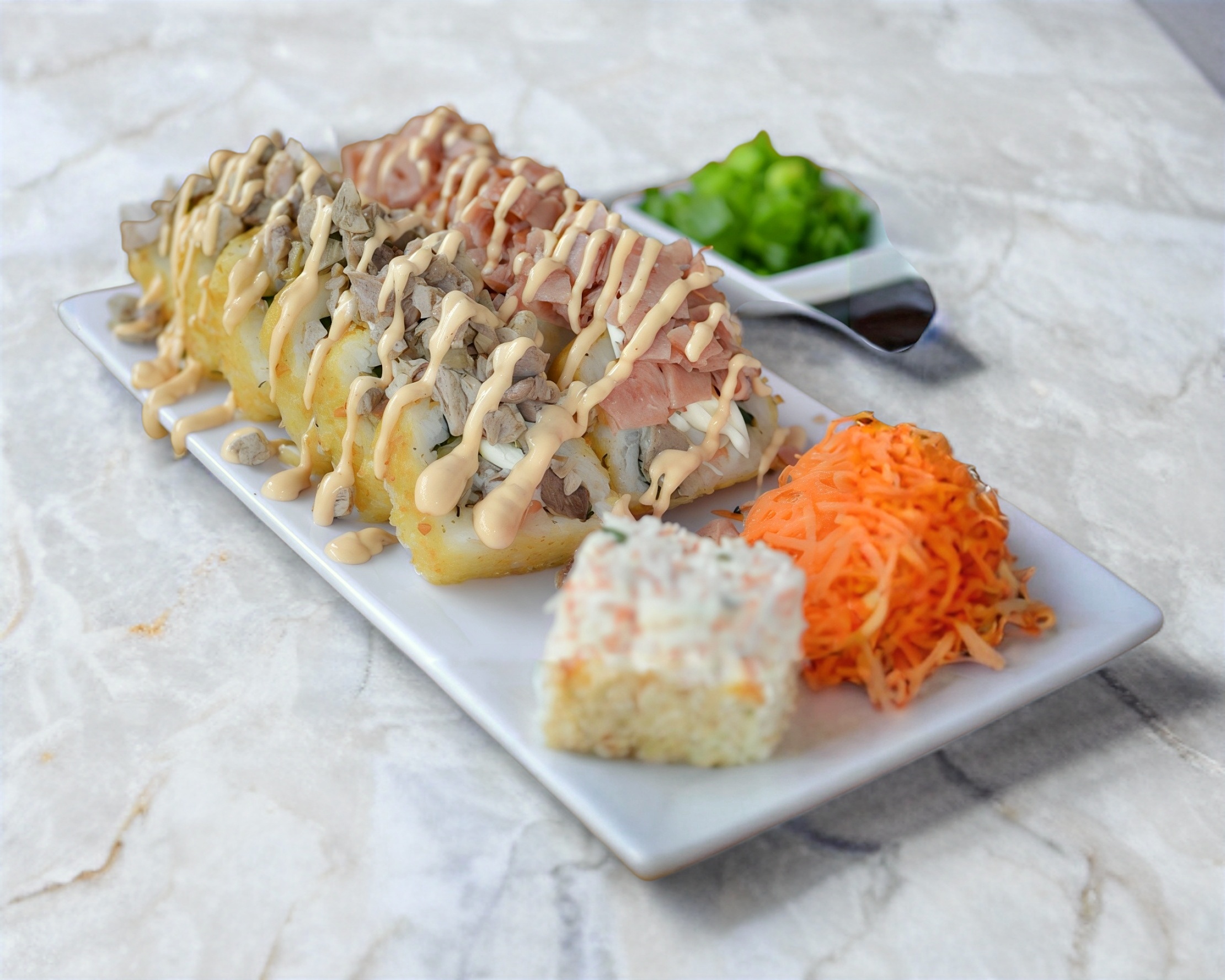 Arroz frito, camarón, res, tampico, pollo, aguacate, Philadelphia, bañado en salsa spicy y salsa de anguila.