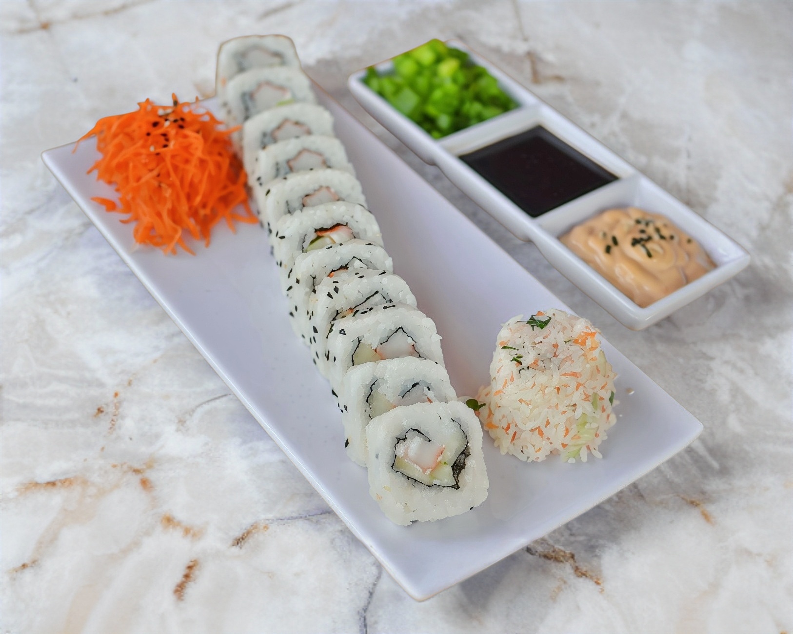 12 Rollos naturales rellenos de surimi, Philadelphia, pepino, forrado de ajonjolí.