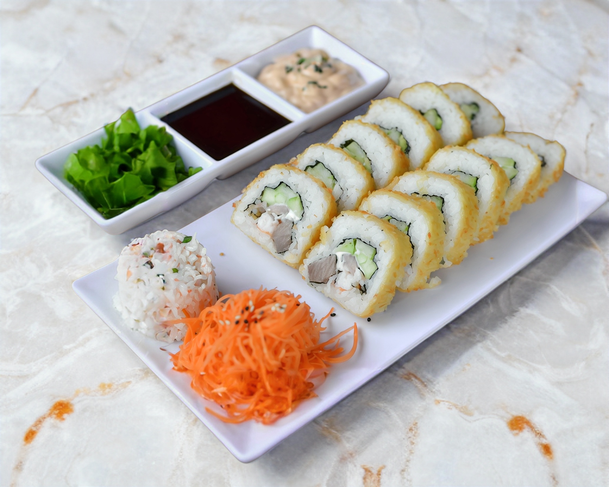 Rollo empanizado, relleno de surimi, pepino y Philadelphia.