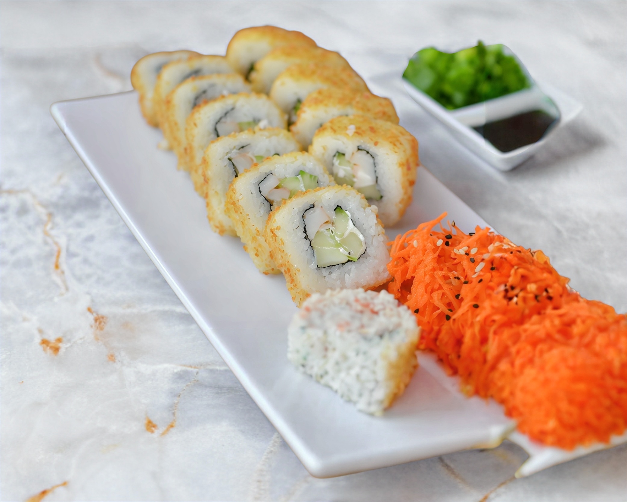 Rollo empanizado, relleno de camarón, jugosa res, aguacate, pepino y Philadelphia.