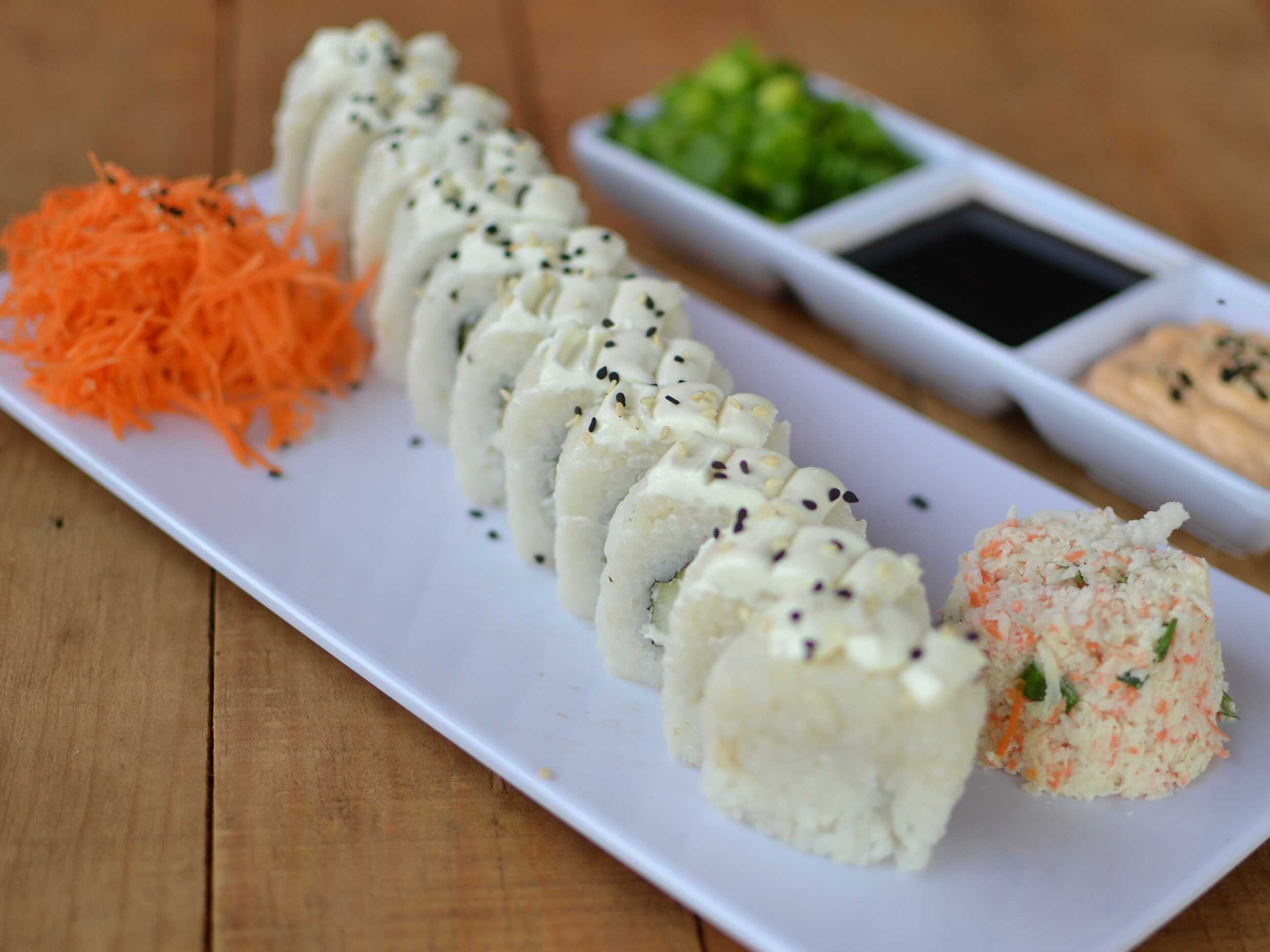 Arroz frito, camarón, Philadelphia, pepino, res, tampico, aguacate, bañado en salsa de anguila.